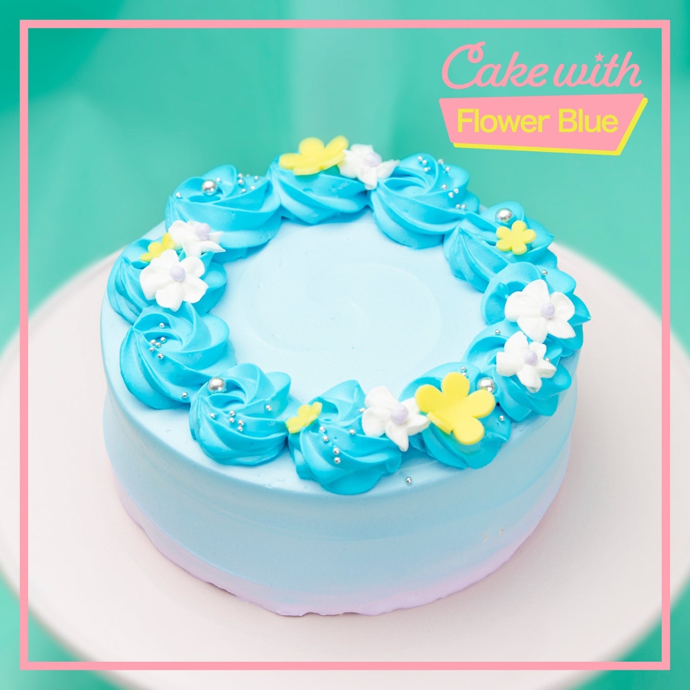 空色のブルーベースに、黄色と白のお花が咲くCuteなケーキ!サイドのデザインは淡いパープルから空色へのグラデーションカラーで仕上げました。