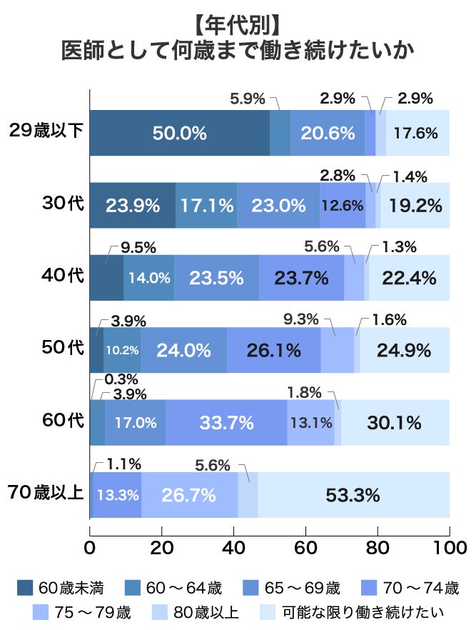 その結果、約8割の医師が、医師の定年年齢の主流である「65歳」以降も働く意欲を示しており、一方で、自身の体力・健康や、年齢を重ねてからの職場探しに不安を感じている実態が浮き彫りになりました。