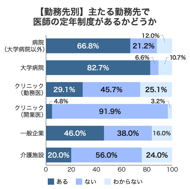 勤務先別では大学病院が最多(82.7%)、病院よりもクリニックで「定年制度あり」が少ない傾向