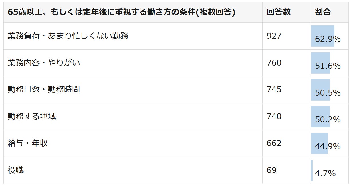 定年後は業務負荷を減らしつつ、やりがいを求める働き方を理想とする回答が多数