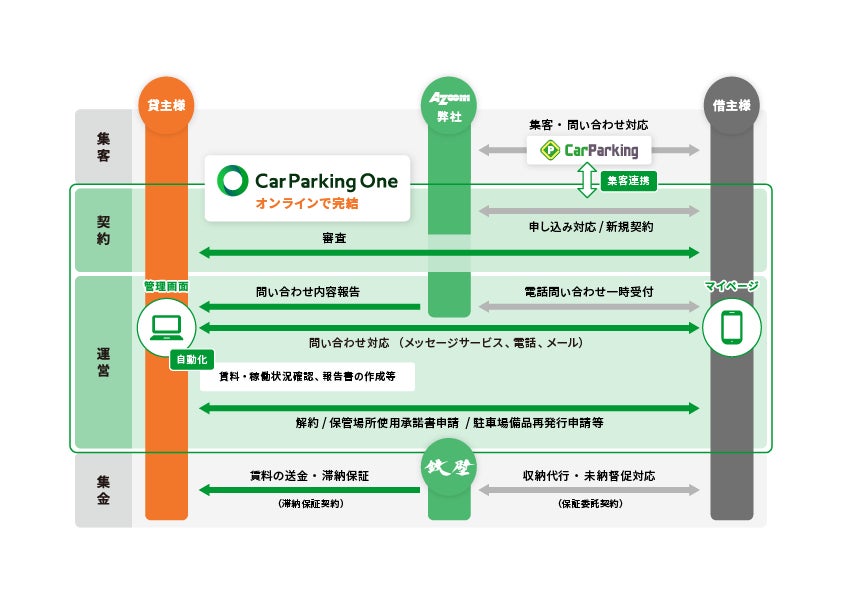 「CarParking One」は、集客から申込・契約の締結、契約管理までをオンライン上で完結できるクラウドシステムです。