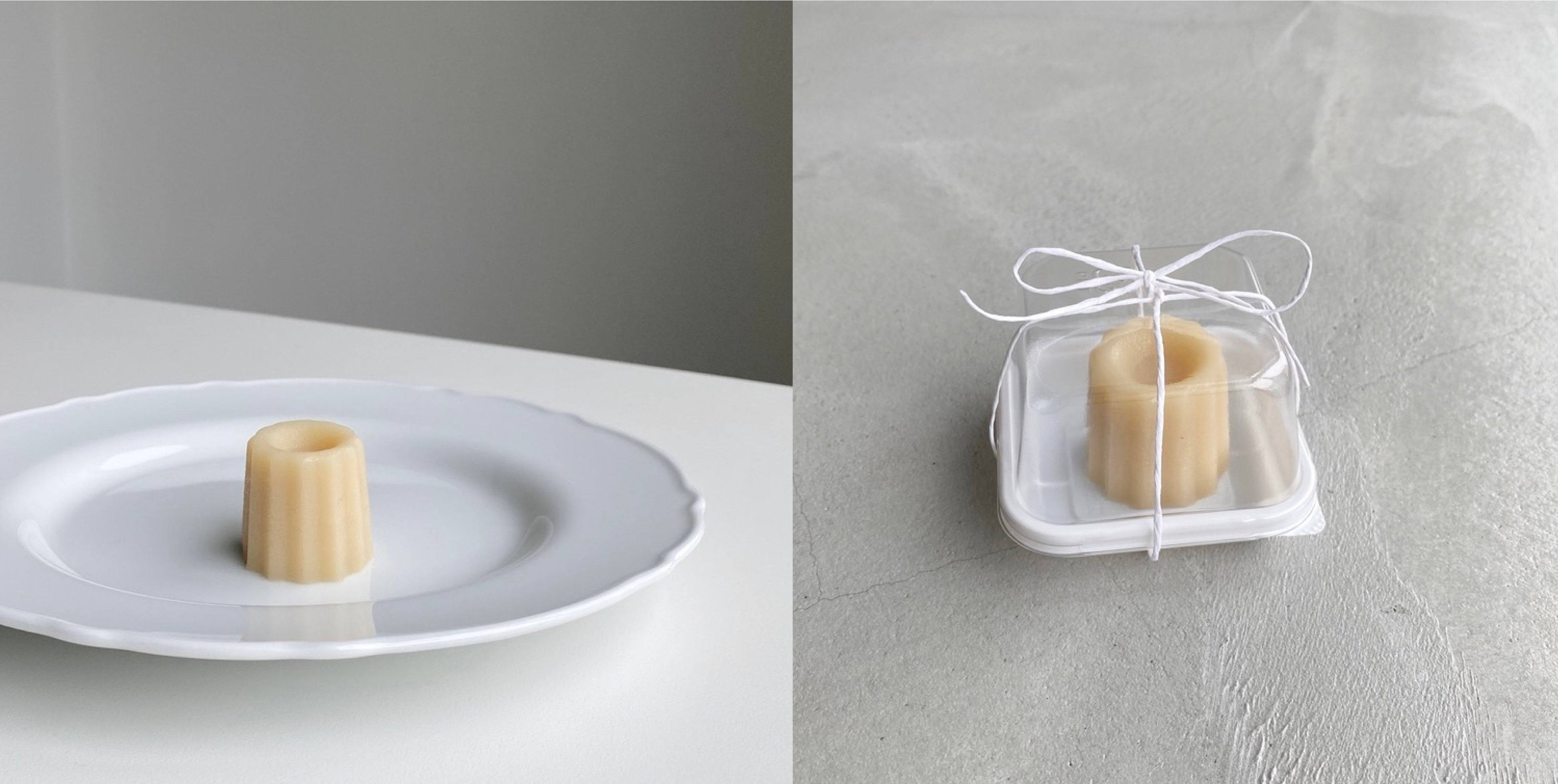 ¥10,000以上お買い上げ頂いたお客様には兵庫県的形の地に構える和菓子屋「井上茶寮」のホワイトチョコレートのカヌレ羊羹をプレゼントいたします。今回の白を基調とした艶やかでキラキラとしたコレクションにマッチする神秘的なカヌレ羊羹をご用意しました。