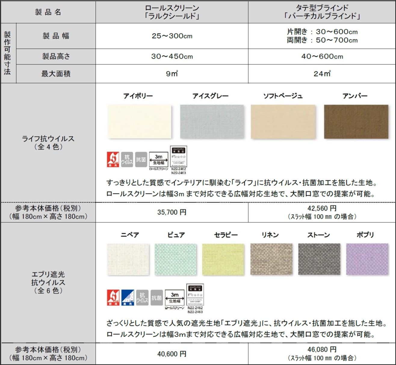 コロナ禍以降、抗ウイルス加工製品に対する需要が拡大し、ホームユースはもちろん、非住宅市場においても衛生面への意識が高まっています。今回、ロールスクリーン「ラルクシールド」やタテ型ブラインド「バーチカルブラインド」で展開している人気の生地の「ライフ」と「エブリ遮光」に抗ウイルス・抗菌加工を施した、「ライフ抗ウイルス」と「エブリ遮光抗ウイルス」を、新規ラインナップします。