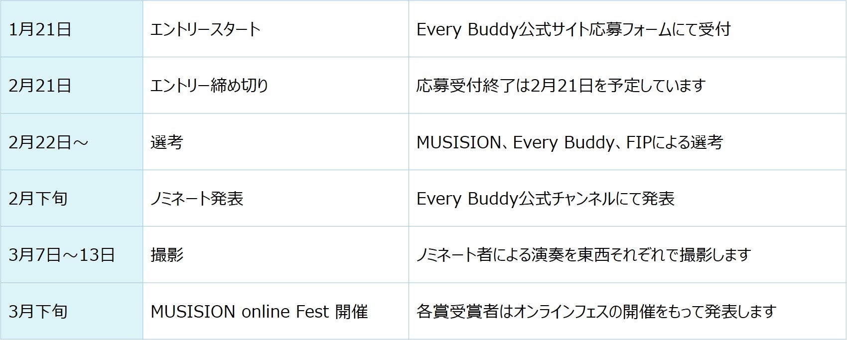 | 2022年6月30日 | エントリー受付スタート Every Buddy TouTubeチャンネルにて詳細テーマの発表 (URL:https://youtu.be/5QZSOvV1s-Y) |