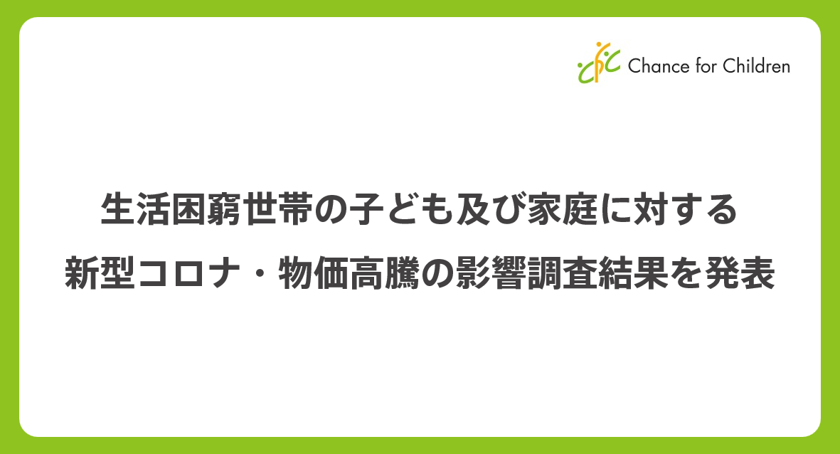 子どもの教育格差の解消に取り組む公益社団法人チャンス・フォー・チルドレン(東京都墨田区、代表者:今井悠介・奥野慧、以下CFC)は、新型コロナや物価高騰が及ぼす子どもや家庭への影響について、中高生の子どもがいる生活困窮世帯の保護者888名に対して行った調査結果を公表しました。