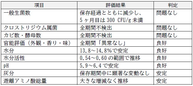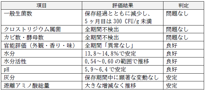 また官能評価では外観・香り・味の各項目において異常は認められず、水分13.8~14.8%、水分活性0.54~0.60、pH5.9~6.4と、理化学的指標についても保存期間中に大きな変動は確認されていません。