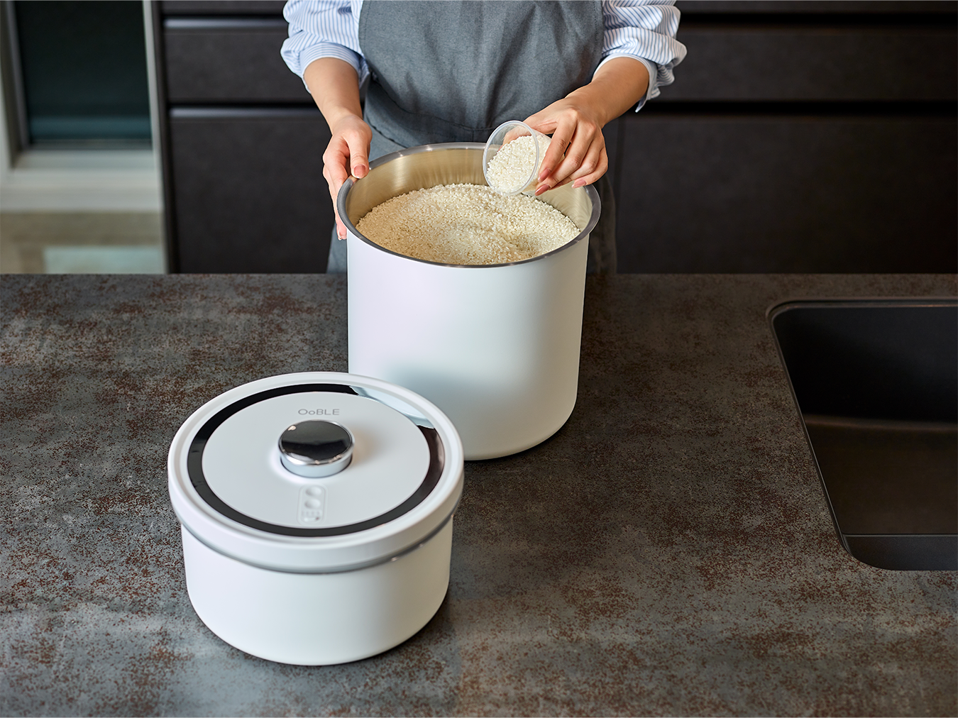 OoBLE rice stockerは、家庭でのお米の保存を主な用途として開発された食品用真空保存容器です。ボタン1つで容器内を真空状態に近づける直感的な操作により、常温保存においても酸素や湿気の影響を受けにくい保存環境を整えることを目的としています。
