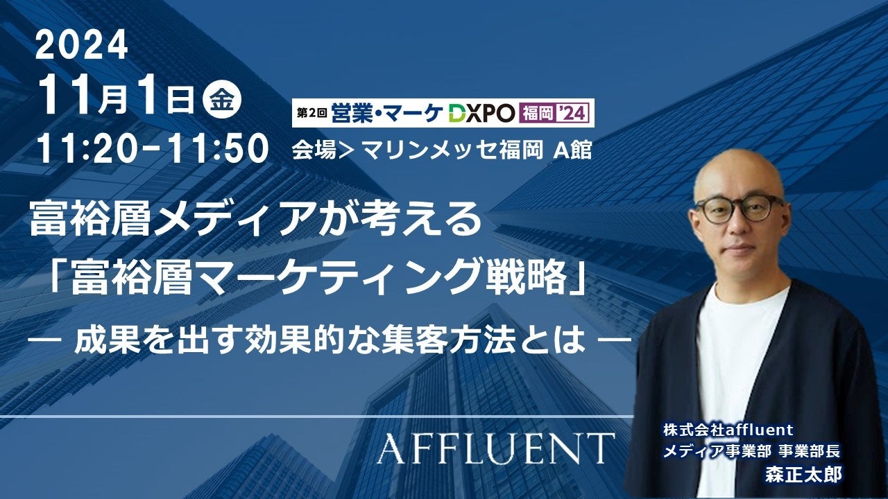 株式会社affluent(東京都港区、代表取締役社長:髙山勇樹)は、マリンメッセ福岡 A館(福岡県博多区)で2024年10月31日(木)~11月1日(金)まで開催される「第2回 営業・マーケDXPO 2024秋」に出展します。