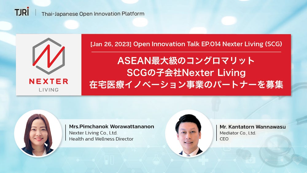 日本とタイをビジネスでつなぐB2Bマッチングプラットフォーム「TJRI」を運営するMediator Co., Ltd.(本社:タイ王国バンコク、代表取締役社長:ガンタトーン・ワンナワス)は、タイの素材最大手SCGの子会社Nexter Living社をゲストに迎え、1月26日(木)日本時間17:00よりオンラインにて「Open Innovation Talk」を開催します。本プログラムでは、同社が募集するパートナー企業の詳細について発表します。タイや東南アジアへのビジネス進出を目指す企業は絶好の機会となります。ぜひご参加ください。