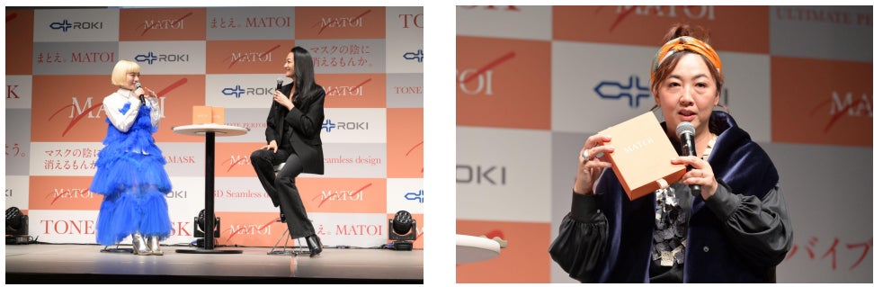 今回の発表会を通じて「MATOI TONE UP MASK」のデザイン性、機能性や製造工程へのこだわりを紹介し、冨永さん、YOUさん、アオイさんから、CMの美しさと前向きなメッセージ性を高くご評価いただき本製品が単なる実用品を超え、ファッションアイテムとして個性を引き立てる存在であることが強調されました。