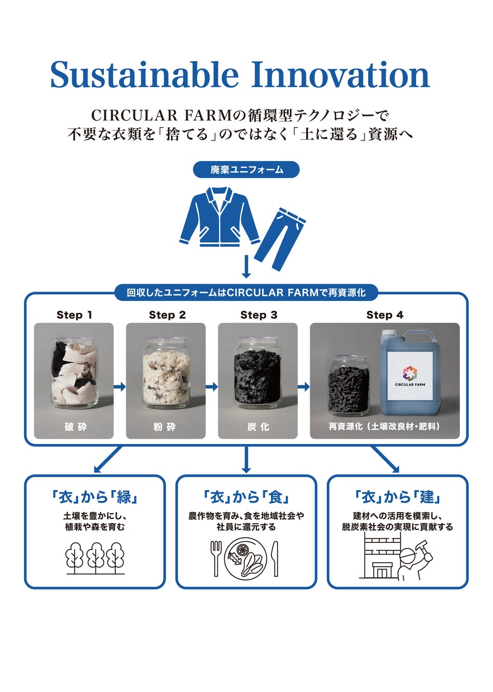 クレサヴァは昨年半年に渡って清水建設とともに、植栽や農作物に与える影響の検証を重ねてまいりました。“CIRCULAR FARM”によって、回収されるユニフォームは豊かな自然を育む土壌改良材へと再資源化され同社の管理する林地や菜園などで有効活用される予定となっています。さらに、将来的には生成される炭化物を建材に活用することも視野に入れ、今回の協業によってユニフォームの完全リサイクルを目指します。