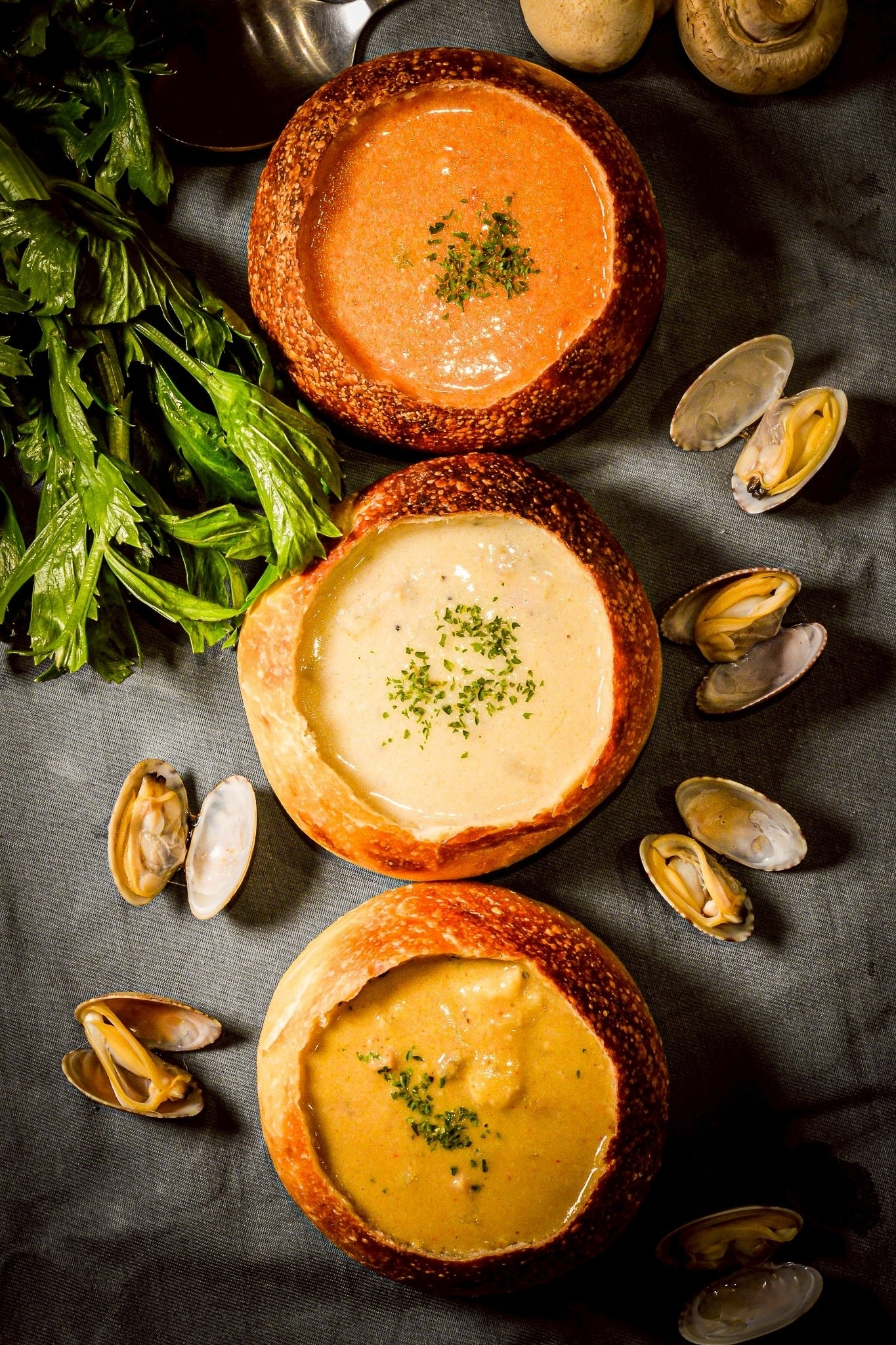 毎日店内で焼き上げる香ばしいブレッド。そこにたっぷり注がれるのは、水を一滴も使わず素材の旨みだけで炊き上げた特製クラムチャウダー。3種類の個性豊かな味わいを、ブレッド容器のままお楽しみください。