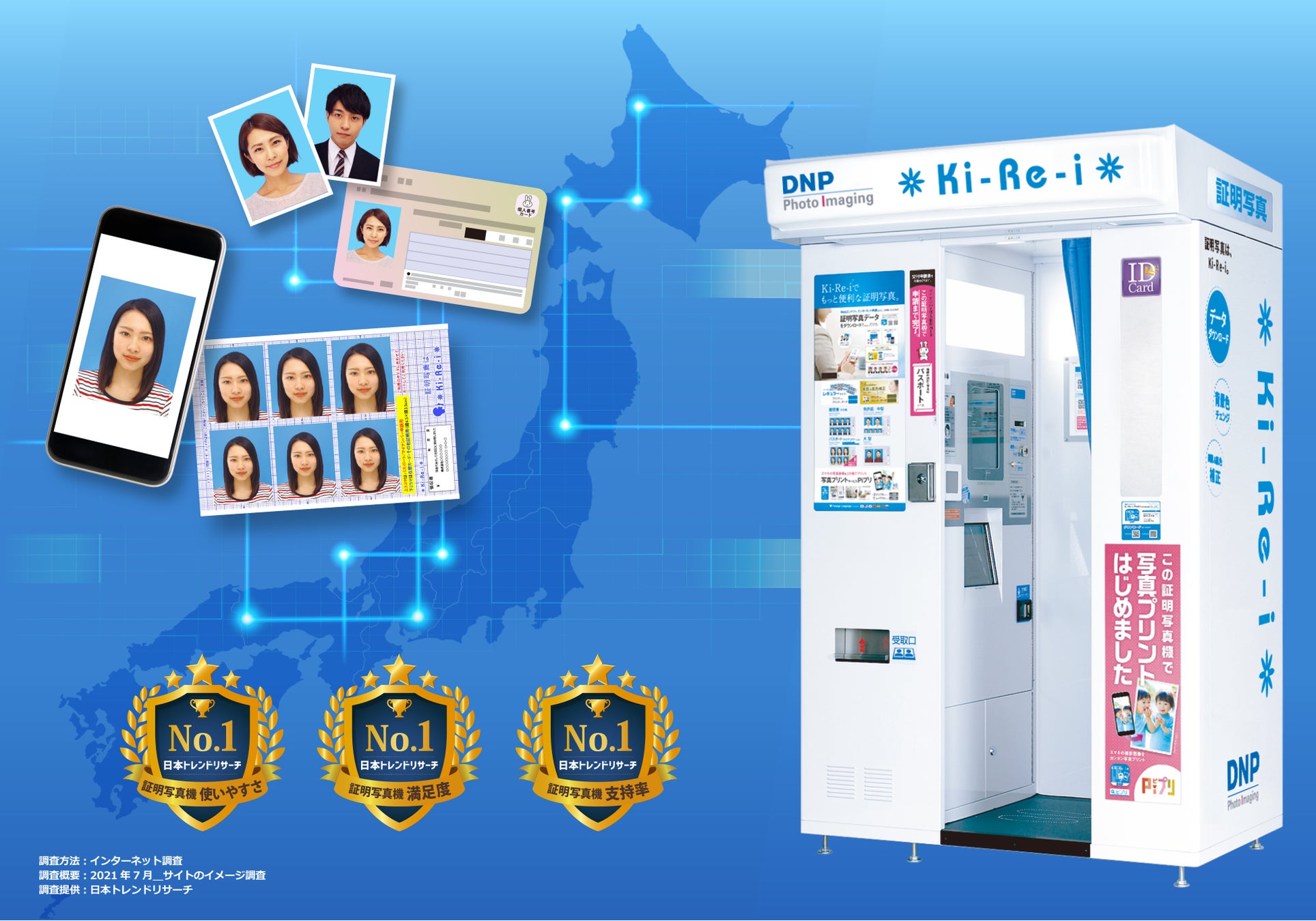■日本では近年、人口の減少に加え、スマートフォンのカメラ機能の向上などによって気軽に顔写真を撮影できることなどから、証明写真機の需要が徐々に減少しています。こうした状況に対してDNPは、全国に設置している「Ki-Re-i」の用途を拡大して、マイナンバーカードのオンライン申請や、各地の「Ki-Re-i」で撮影した顔写真を社員証用にネットワークで収集するといった多様なサービスを提供しています。