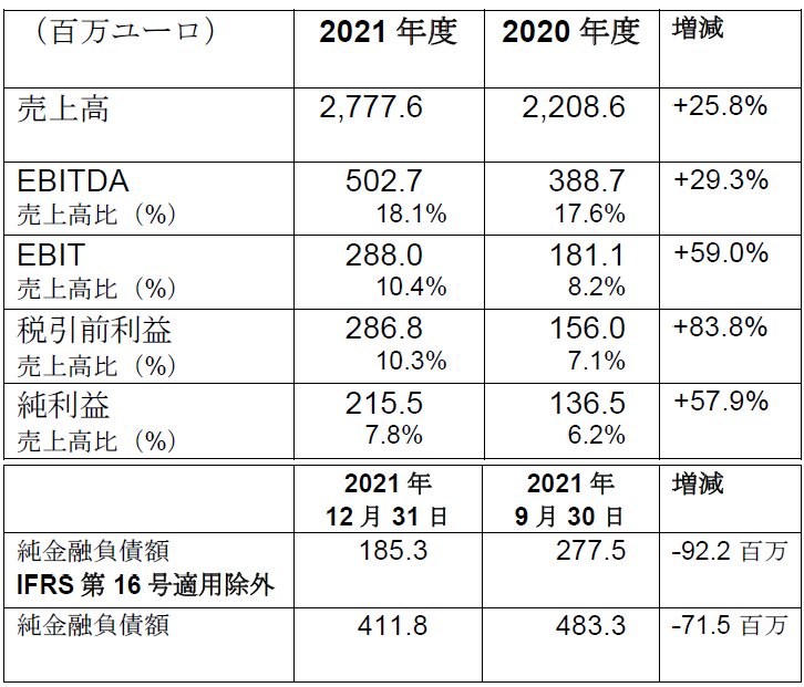 ブレンボグループ 2021年度 連結業績(IFRS基準)