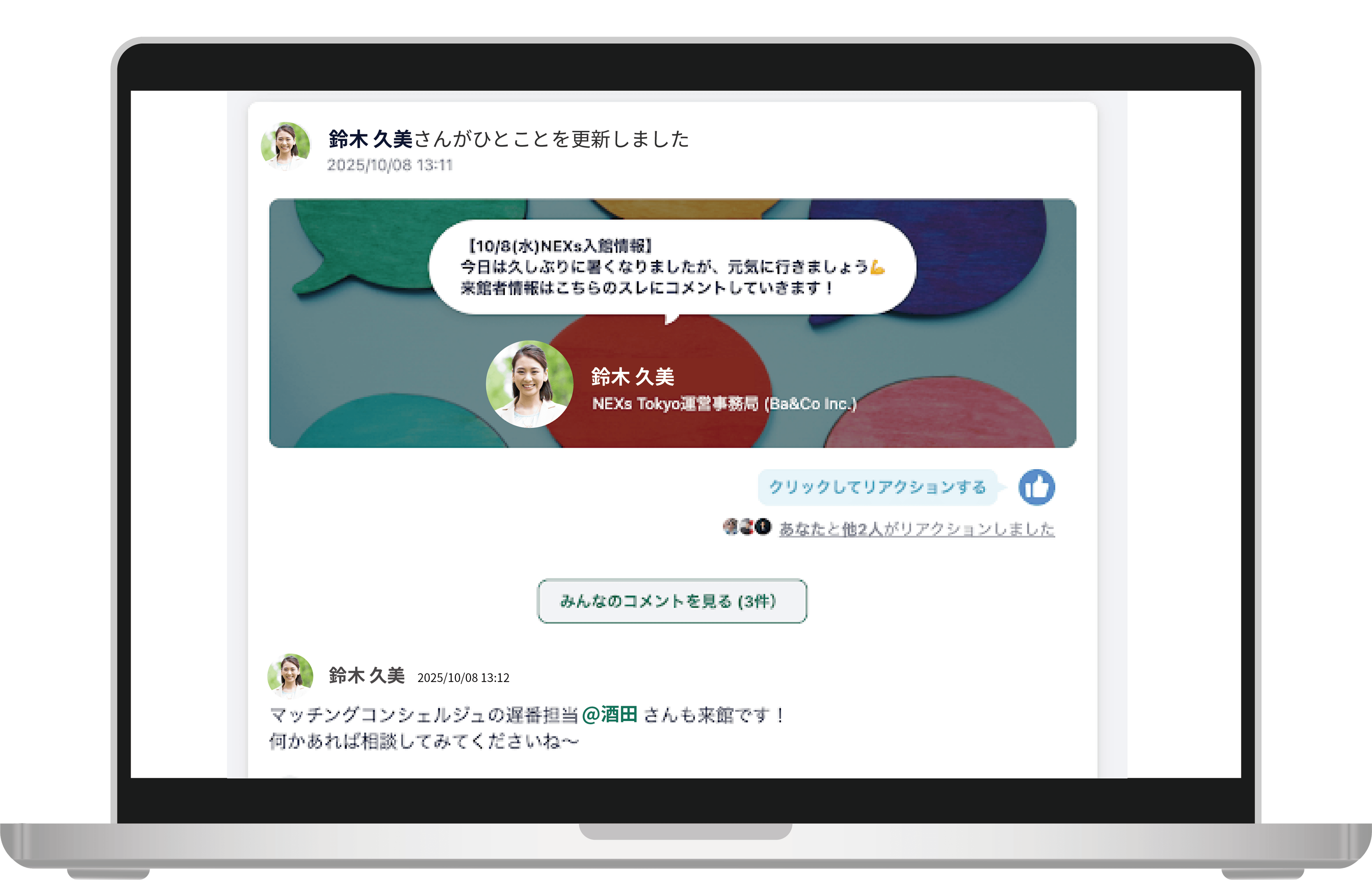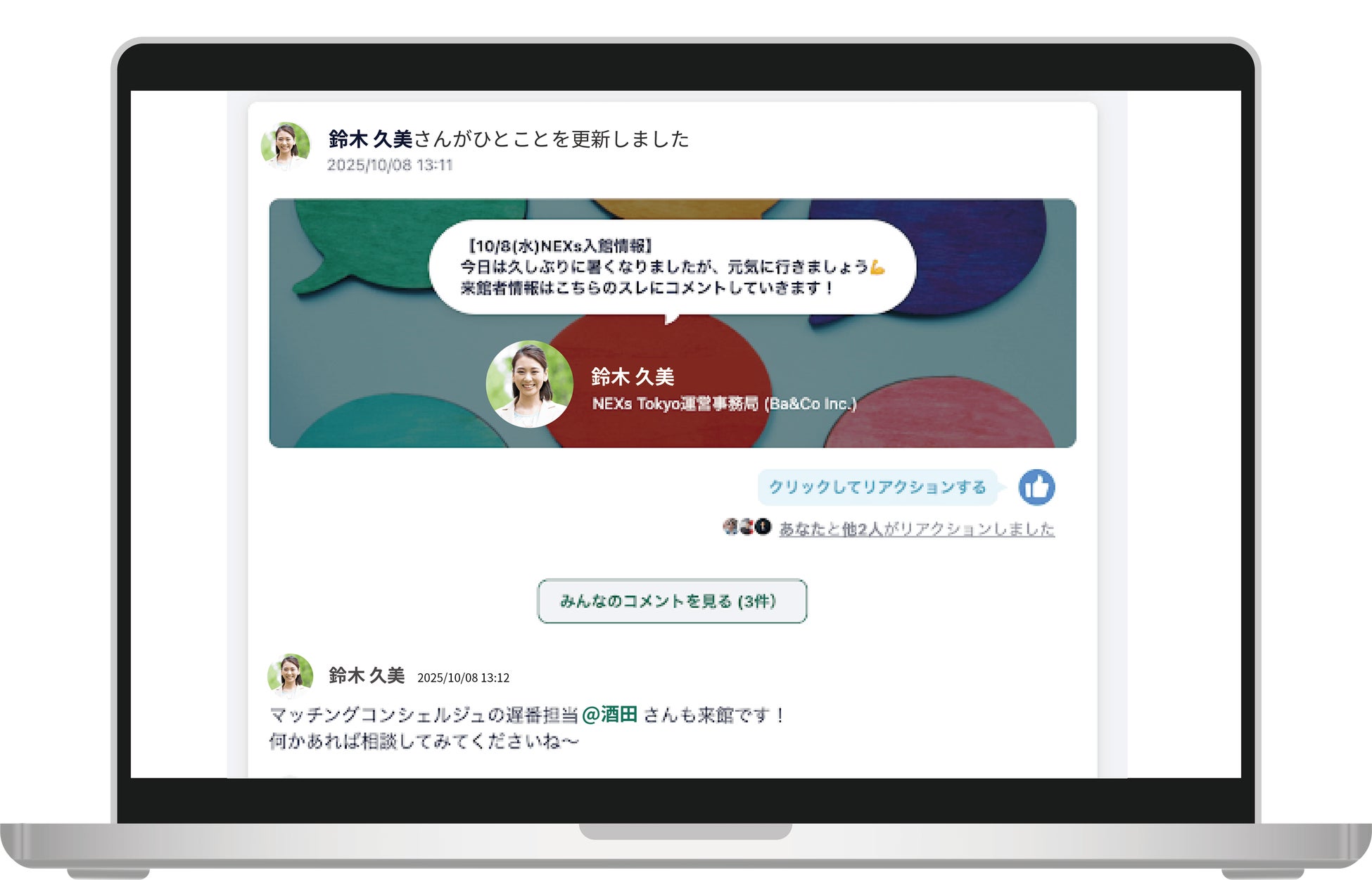 「〇〇さん来館しています!」といった、コミュニティスタッフの投稿や、「NEXs Tokyoに来ています!」といった来館者による投稿により、今施設にいる人の情報が可視化される