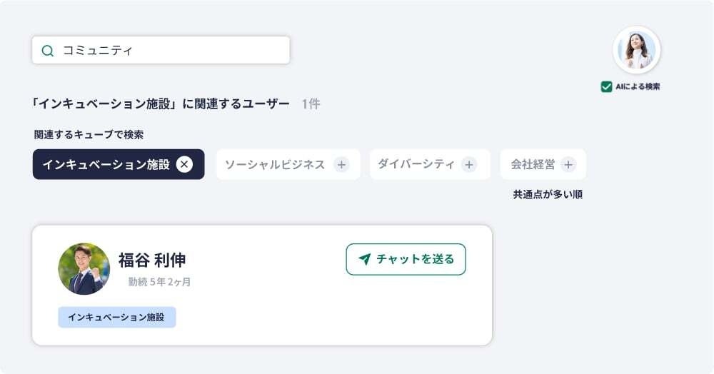 会員情報(パーソナリティやスキル、興味関心等)をAIによって検索し、繋がりたい会員を簡単に見つけられる。