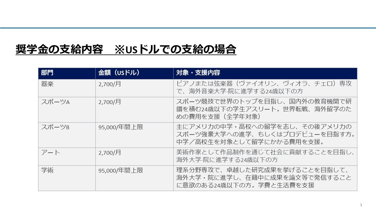 世界でずば抜けた活躍を志す、4つの部門(器楽・スポーツ・アート・学術)の学生に返済不要の奨学金を支給