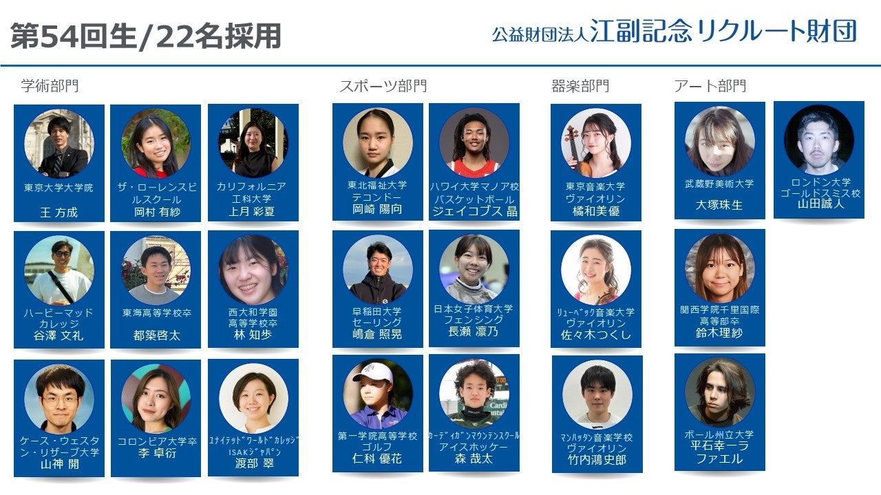 公益財団法人江副記念リクルート財団(所在地:東京都港区、代表理事理事長:峰岸真澄、以下当財団)は世界に挑戦し、ずば抜けた活躍をしそうな日本の若者への支援を目的に50年以上にわたり、返済不要の給付型奨学金「リクルートスカラシップ」を実施しています。この度、第54回生として、世界で活躍することを目指す学生22名を採用したことをお知らせいたします。