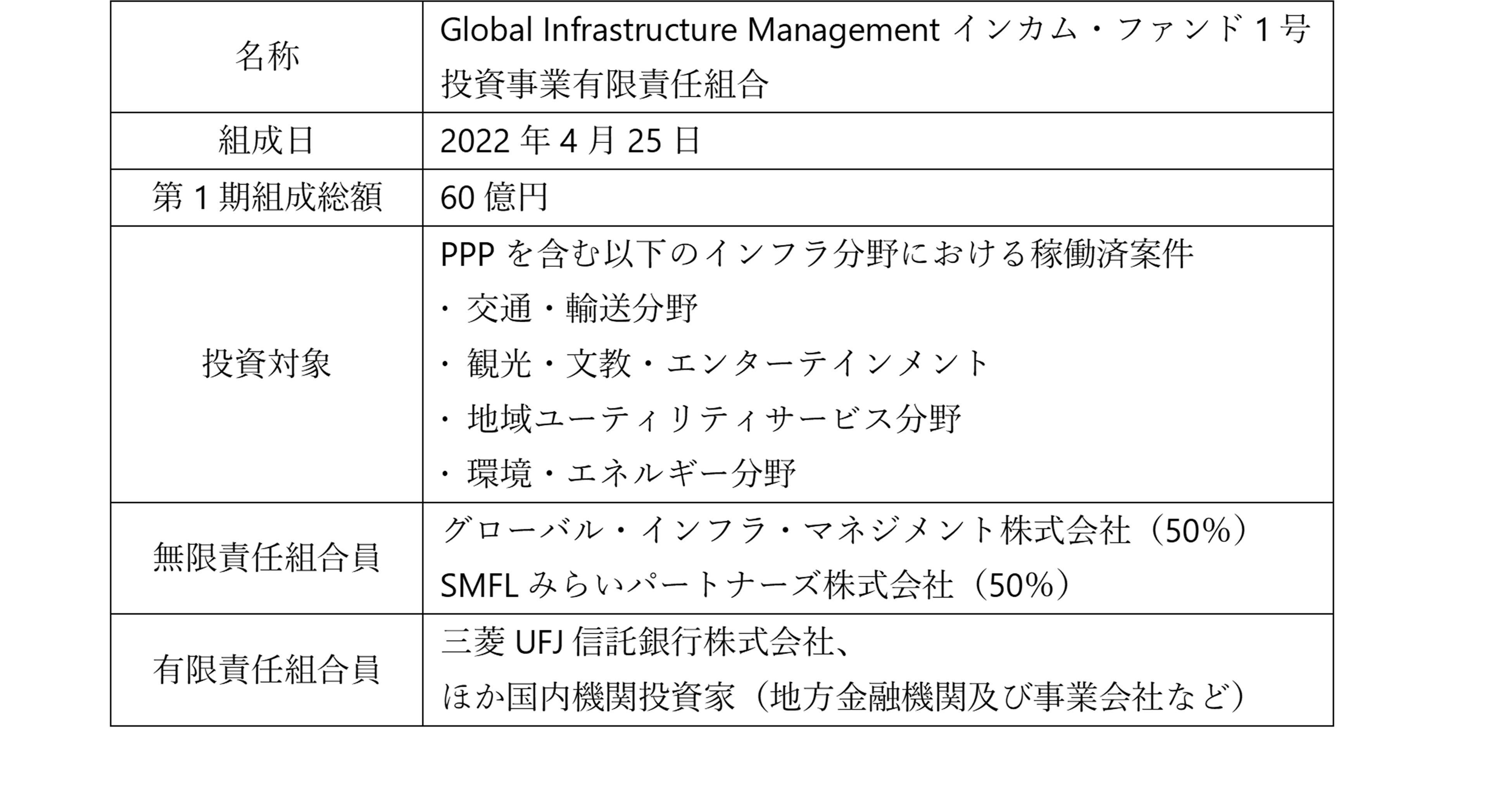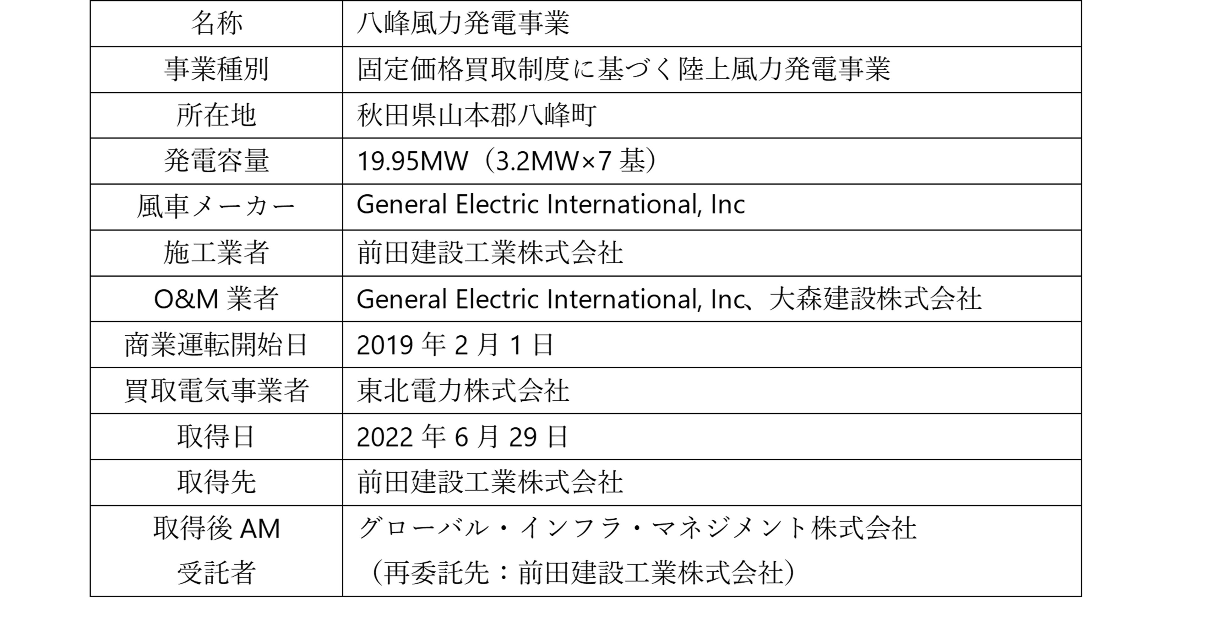 グローバル・インフラ・マネジメント株式会社(本社:東京都千代田区、代表取締役:岐部 一誠、土田 博志、以下「G社」)、および三井住友ファイナンス&リース株式会社(本社:東京都千代田区、代表取締役社長:橘 正喜)の戦略子会社であるSMFLみらいパートナーズ株式会社(本社:東京都千代田区、代表取締役社長:寺田 達朗)は、共同無限責任組合員(GP)として、国内の稼働済みインフラ事業等を投資対象としたインフラファンド、Global Infrastructure Managementインカム・ファンド1号投資事業有限責任組合(以下「本ファンド」)を、三菱UFJ信託銀行株式会社(本社:東京都千代田区、取締役社長:長島 巌)をはじめとする国内機関投資家と共同で組成し、その第1号投資案件として、秋田県八峰町の風力発電事業への投資を完了しましたことをお知らせします。