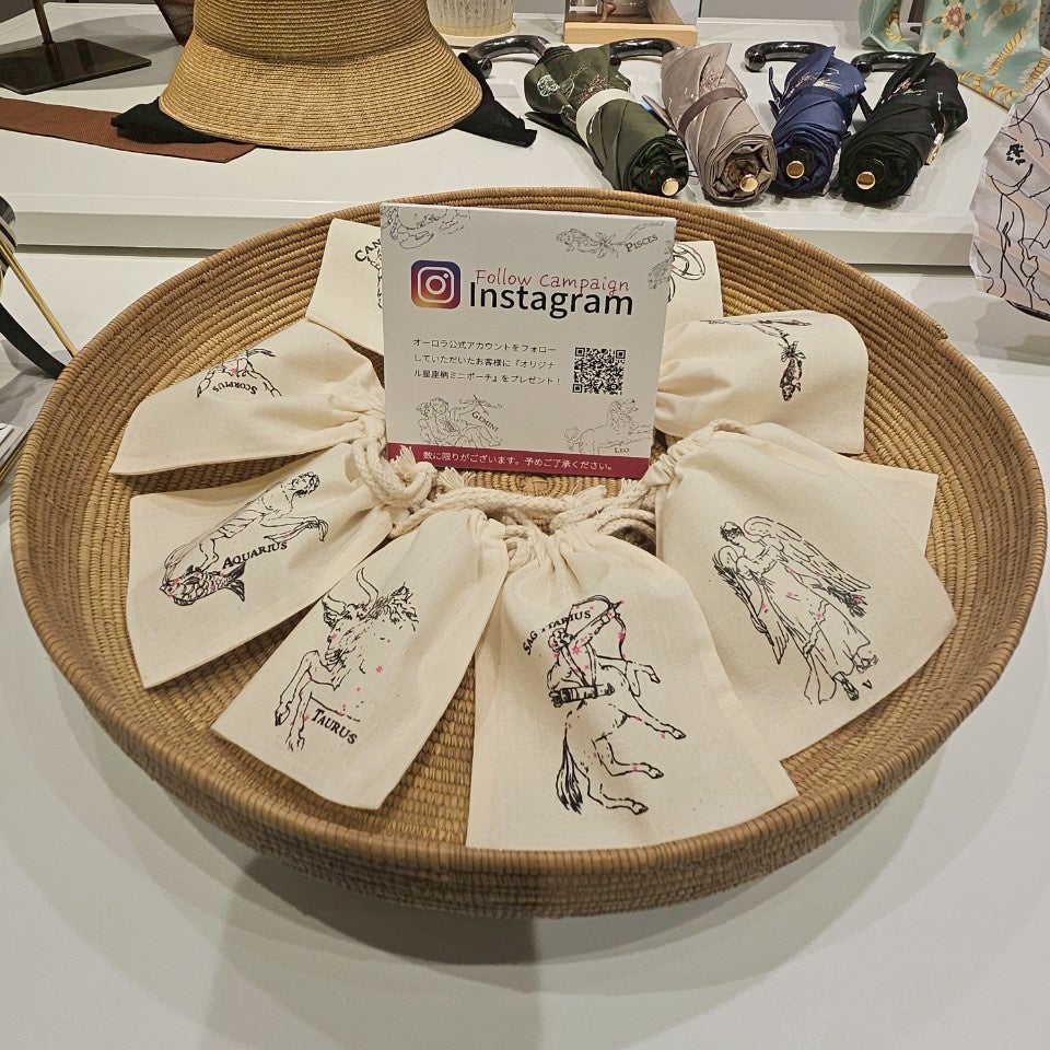 オーロラの公式Instagram「@aurora_1896」を新規でフォローいただいたお客様に<オリジナル星座柄 ミニ巾着>をプレゼント!
