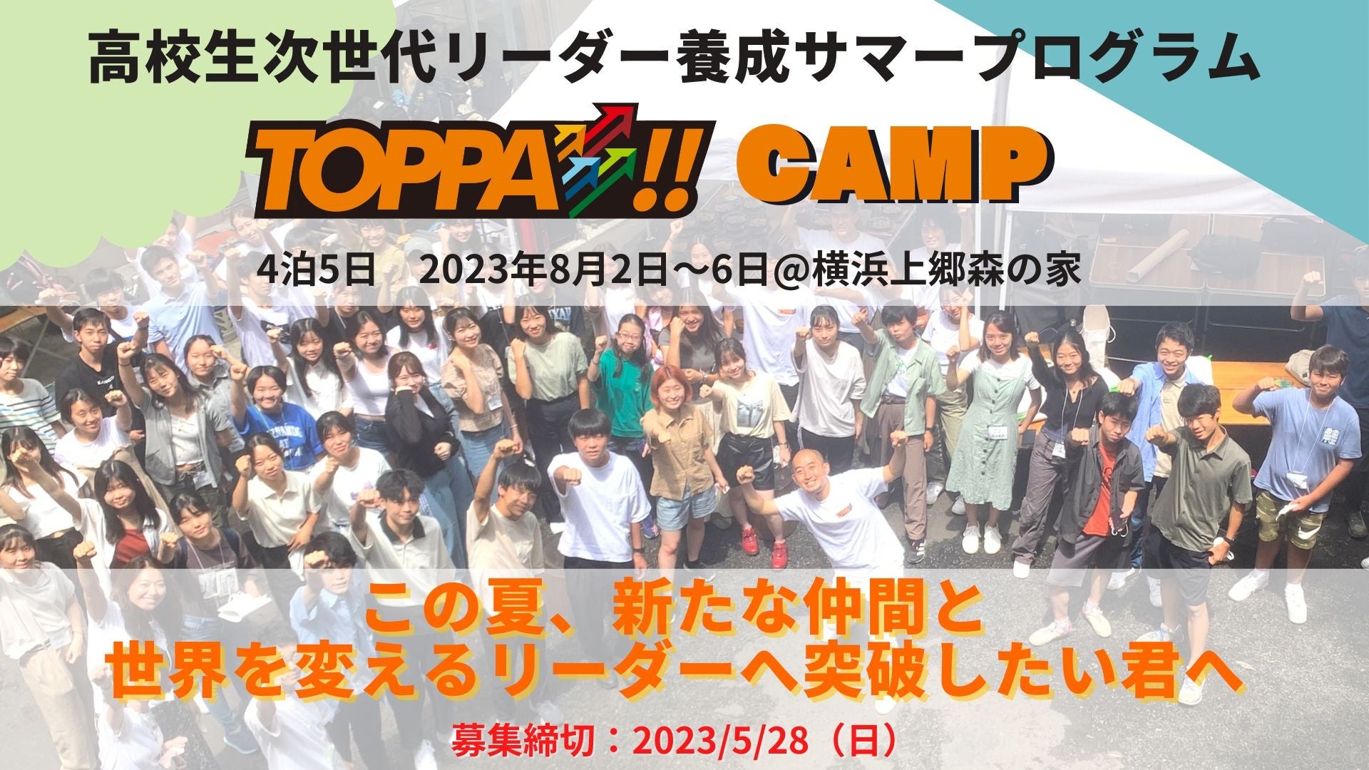 なお、本プログラムは高校生向けの体系的・実践的次世代リーダー養成プログラム「TOPPA!!」の最新サマープログラムです。インプットとして最前線で活躍するロールモデルとなる社会人らから講義を受けつつ、アウトプットとしてリアルな社会課題解決に濃密に取り組み、社会にインパクトを生むリーダーを高校生・中学生から養成します。