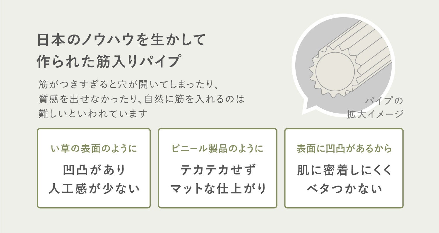 萩原独自の製法でパイプの表面に筋を入れているので、ビニール製品のようなテカリがなくマットな仕上がりです。筋を入れることでパイプ表面に凹凸ができ、肌に密着しにくくなるためベタつきません。