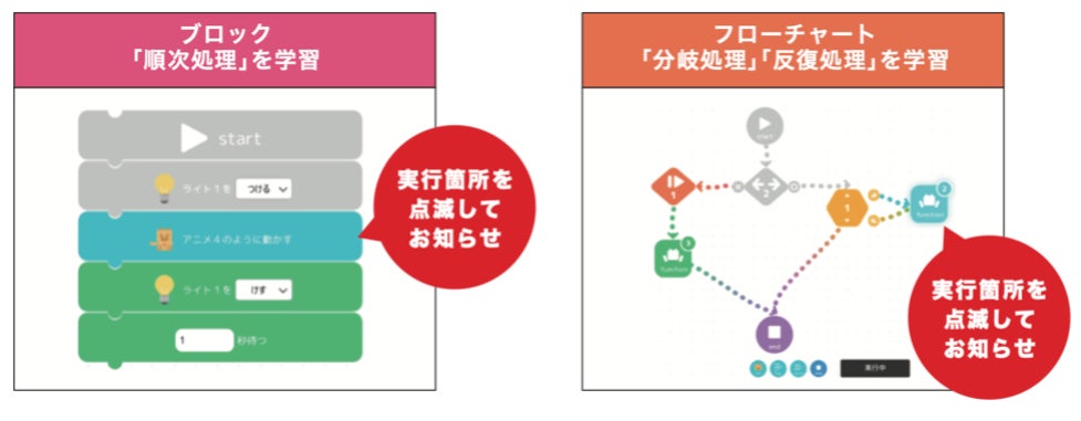 スマートフォン/タブレットで利用できる無料アプリです。ブロック式とフローチャート式の2種類のインターフェースを備えており、フローチャート式のプログラミング教材アプリは少なく、教育関係者からも高評価を得ています。