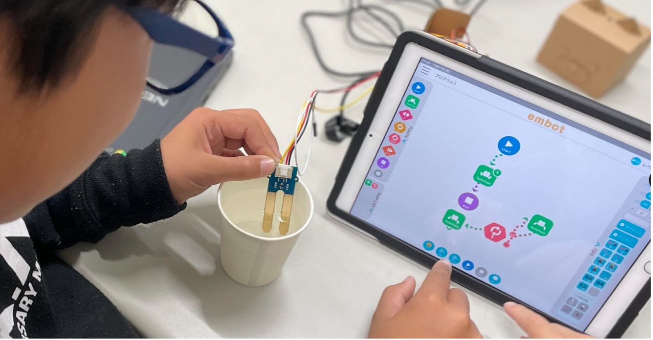 embot+にアナログセンサである土壌水分センサや音量センサを用い、身の回りの情報を収集・分析するプログラム開発を通して、embot+での学習活用の有用性を検証しました。