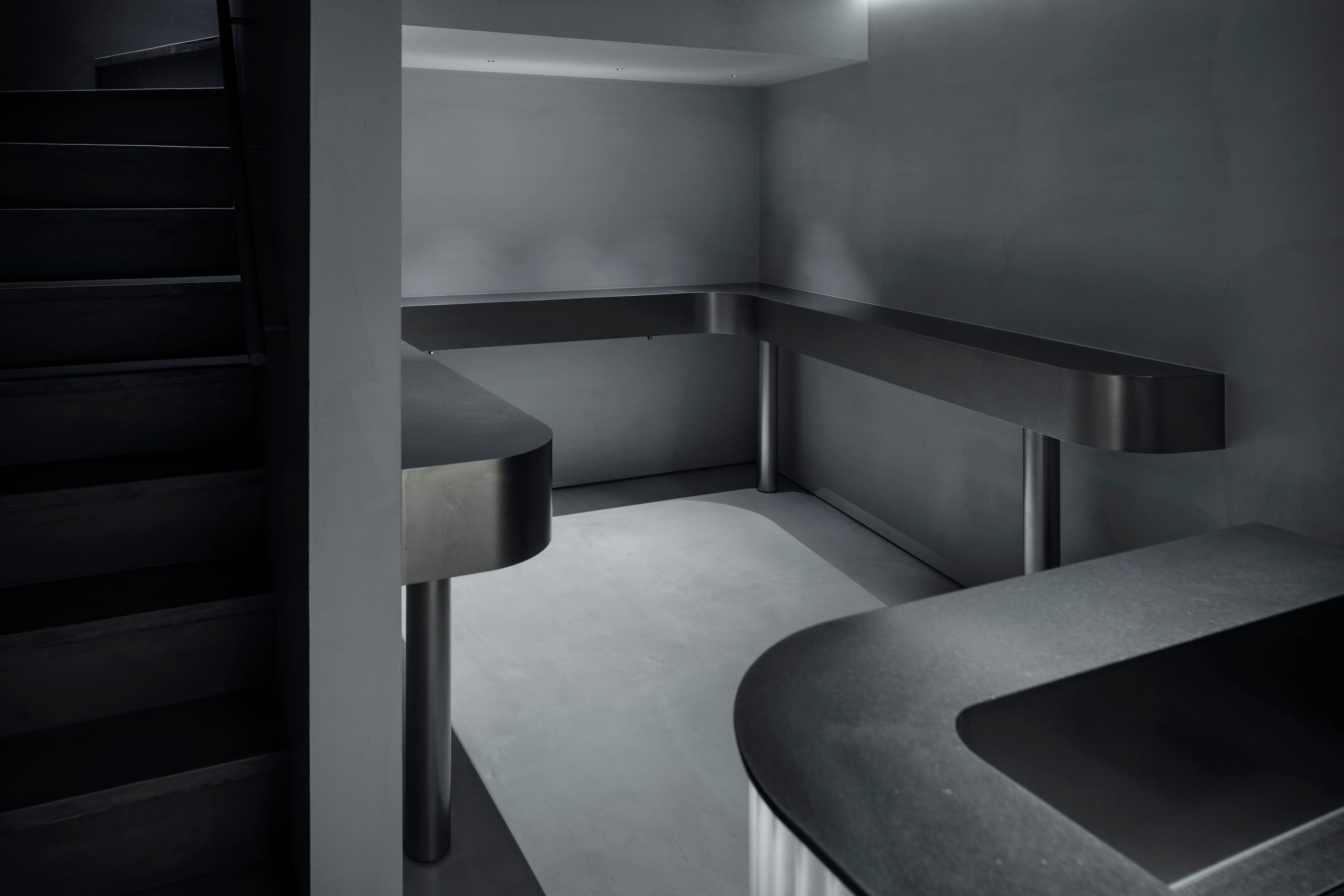店内は近未来的な印象を与えるシルバー調で統一され、2階の飲食スペースはガラスも組み合わされることで「未来のコーヒー体験」を演出しています。一方で壁に据え付けられたベンチは座面が膝までと広く取られており、ゆったりと座ってコーヒーを楽しんでいただくことが可能です。