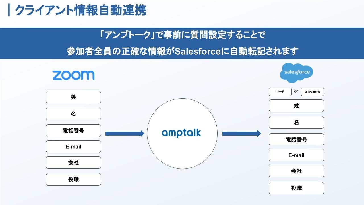 株式会社amptalk(本社:東京都渋谷区、代表取締役社長:猪瀬 竜馬、以下 amptalk)は、IP電話やオンライン商談の自動書き起こしを中心としたオンライン商談支援ツール「アンプトーク」において、Zoomの入室時に取れる情報(メールアドレス、会社名、電話番号、役職、その他自由質問)を自動でSalesforceのリードか取引先責任者のオブジェクトに転記する新機能を2022年8月23日(火)、提供開始。