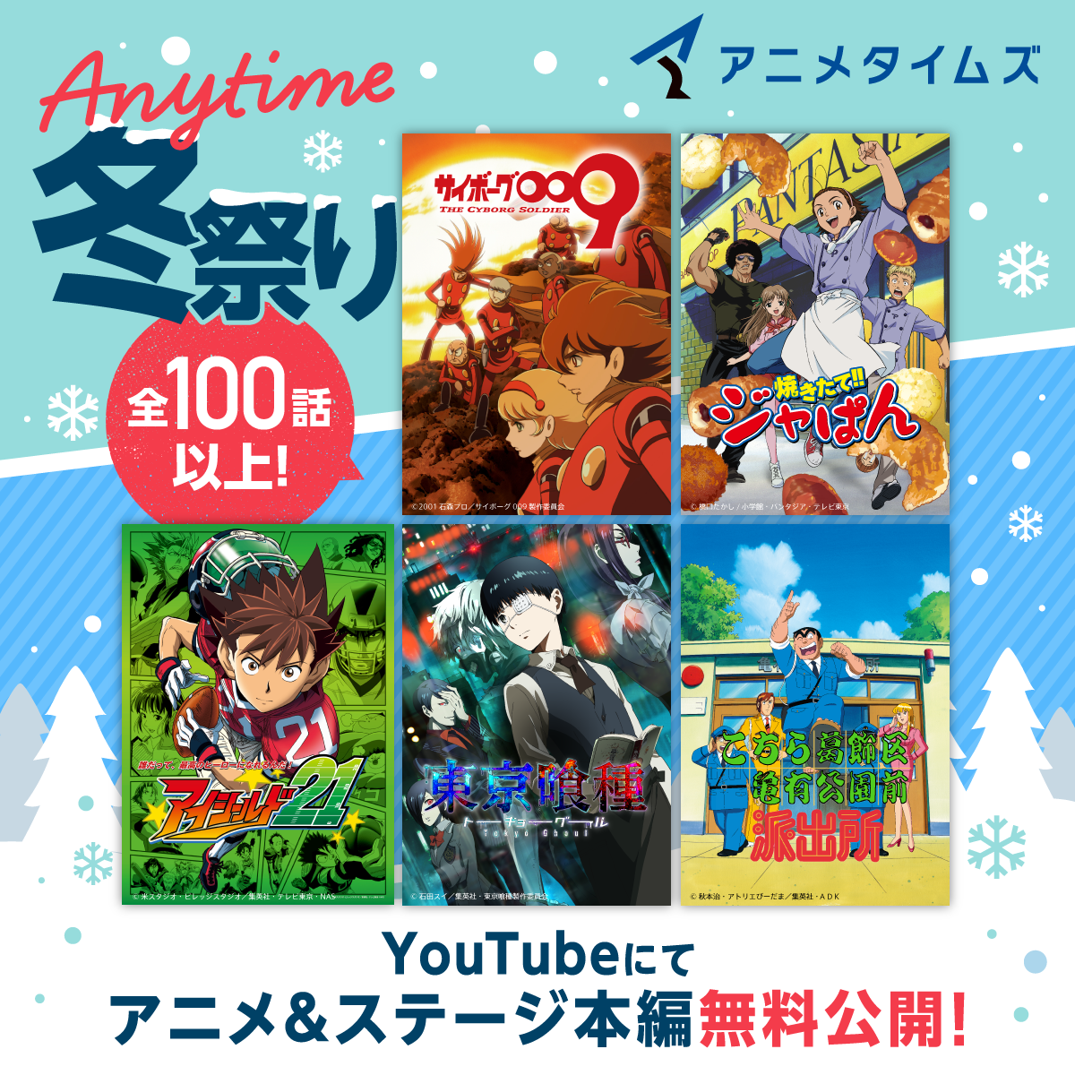 エイベックス・ピクチャーズ、講談社、集英社、小学館ら14社からなる株式会社アニメタイムズ社(本社:東京都港区、 代表取締役社長:勝股 英夫、以下「アニメタイムズ社」)は、Amazon が運営する Prime Video チャンネルのアニメ専門チャンネル 『アニメタイムズ』 年末年始の特別企画として、 「Anytime 冬祭り」を開催いたします。本企画では、『アニメタイムズ』公式YouTubeチャンネルにて、大人気アニメやファン待望のステージ本編など、全100話以上を期間限定で無料公開いたします。