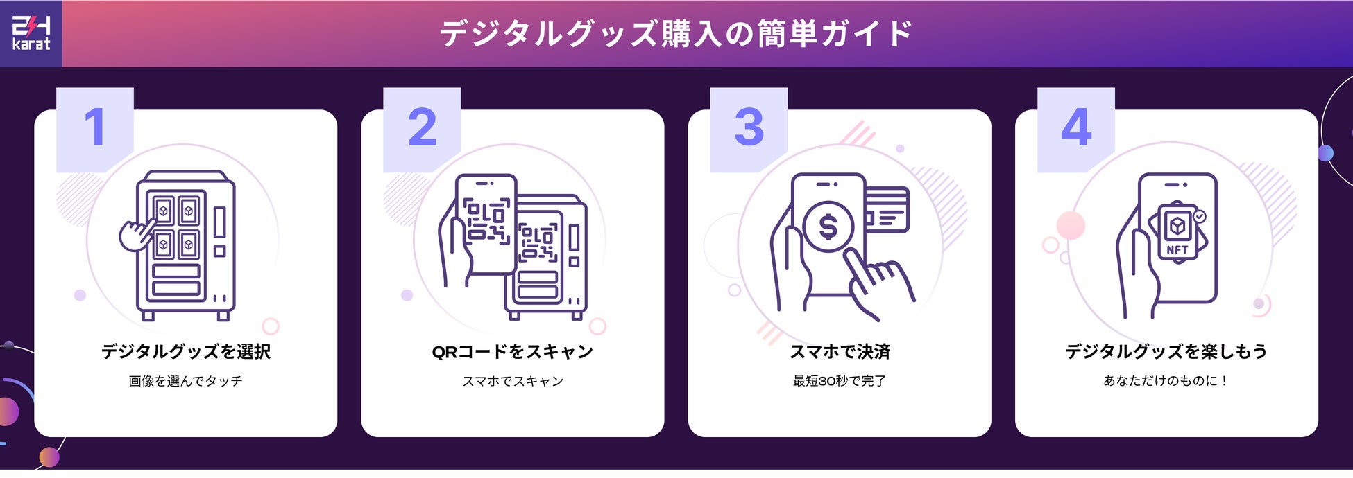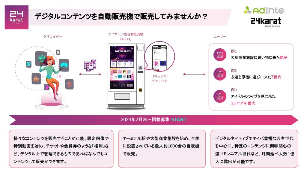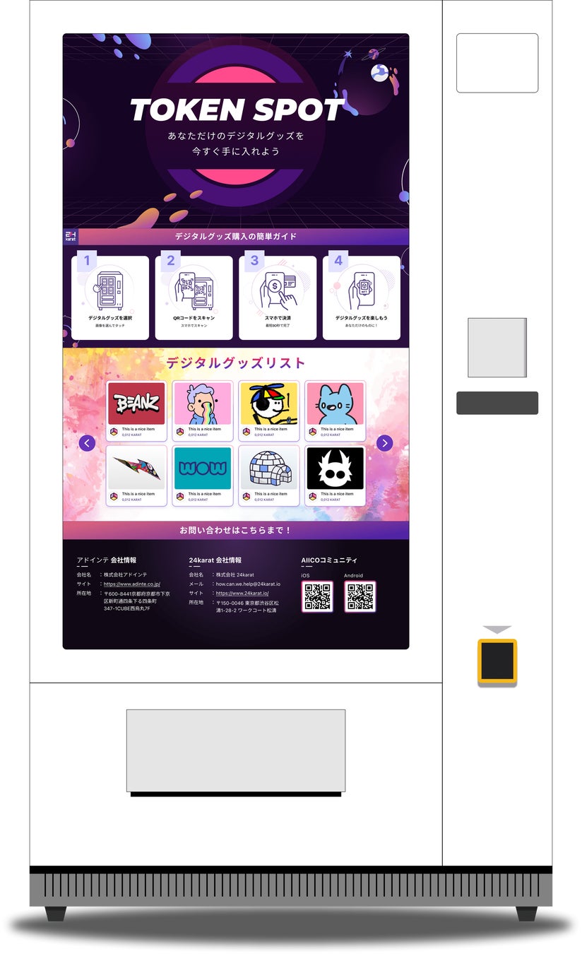 2024年2月より、利用総数13万人を超える『24karat ウォレット』とサイネージ型自販機『AIICO』が共同でNFT販売を開始。全国配置最大約1000台を通じて月間延べ人数約1億人にリーチ。