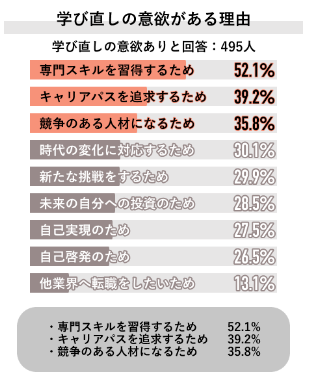 また、学び直し意欲の理由を聞くと「専門スキルを習得するため」が52.1%で最多回答になり、次いで「キャリアパスを追求するため」が39.2%、「競争力のある人材になるため」が35.8%で上位3つの回答結果になりました。