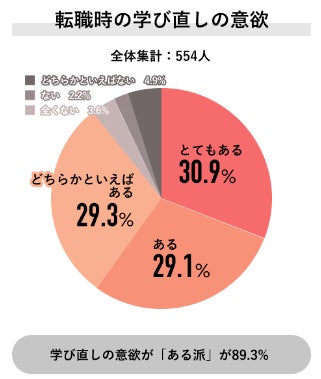 「2023年 転職とリスキリングの意識調査」(n=554)によれば、 回答者全体の554人に転職時に学び直しをする意欲有無を聞くと、「とてもある」30.9%、「ある」29.1%、「どちらかといえばある」29.3%を合算した89.3%が”ある派”を回答しました。