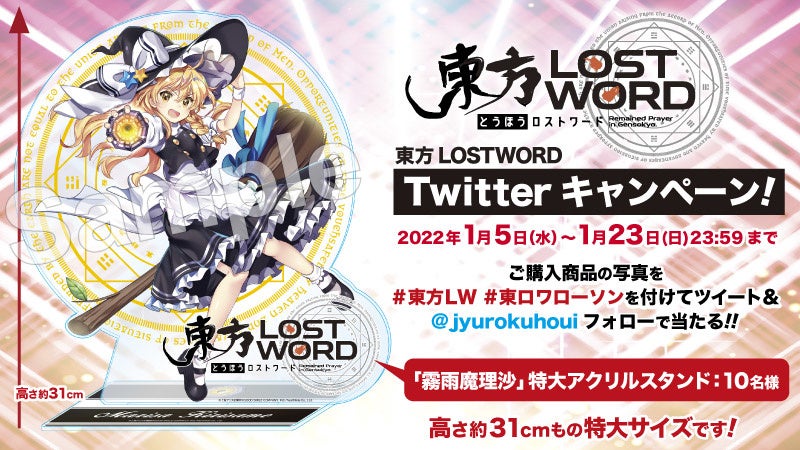 2022年1月5日(水) 〜 1月23日(日) 23:59までで、「霧雨魔理沙」特大アクリルスタンドがあたるキャンペーンも実施中!詳しくはこちらへ♪https://16d.jp/page/touhoulostword_lw2022.html
