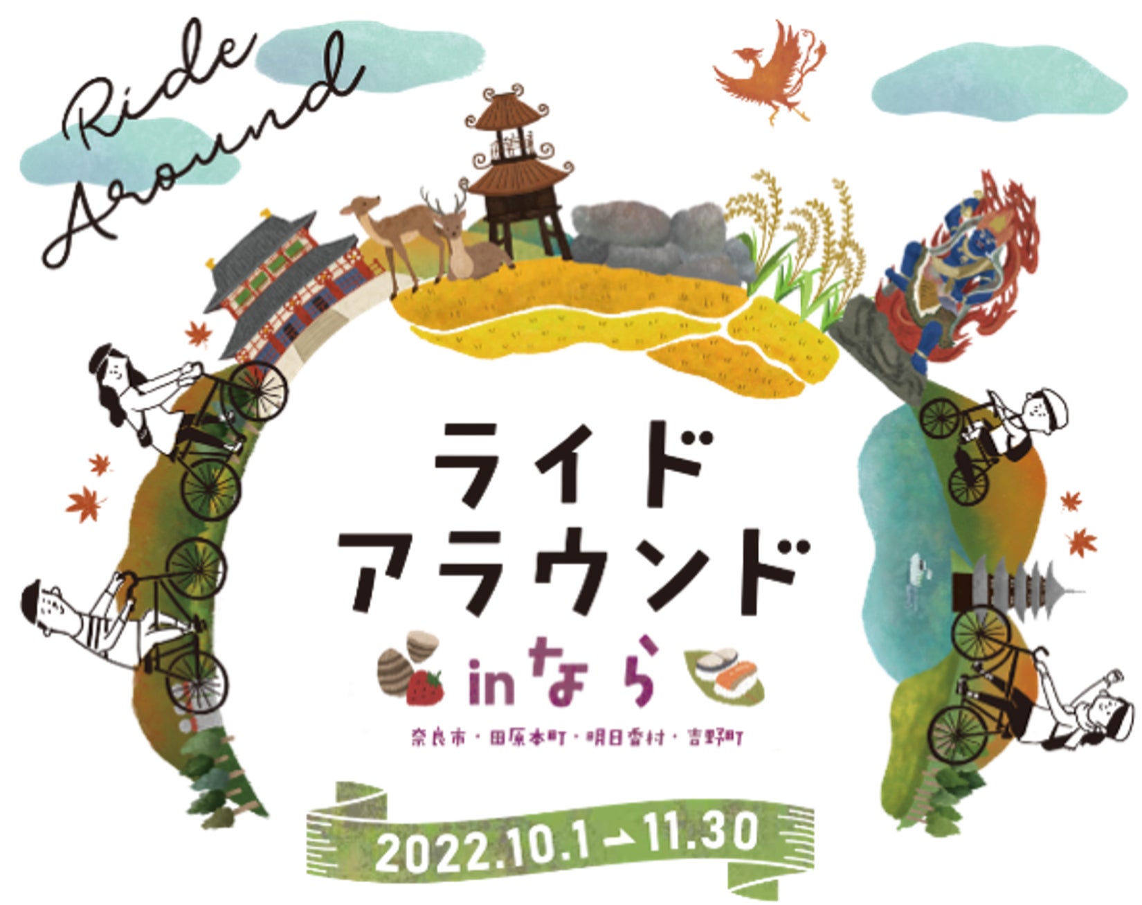 「ライドアラウンドinなら」は、美味しいグルメと歴史・文化が溢れる奈良県内の4市町村を舞台にスマートフォンの位置情報サービスを活用したアプリを用いて実施する自転車周遊型イベントです。本年度は、奈良市・田原本町・明日香村・吉野町に加え、大和郡山市・天理市・橿原市・桜井市・川西町・三宅町・高取町が新しくスポットに加わり、合計11市町村を楽しみながら周遊する事ができます。