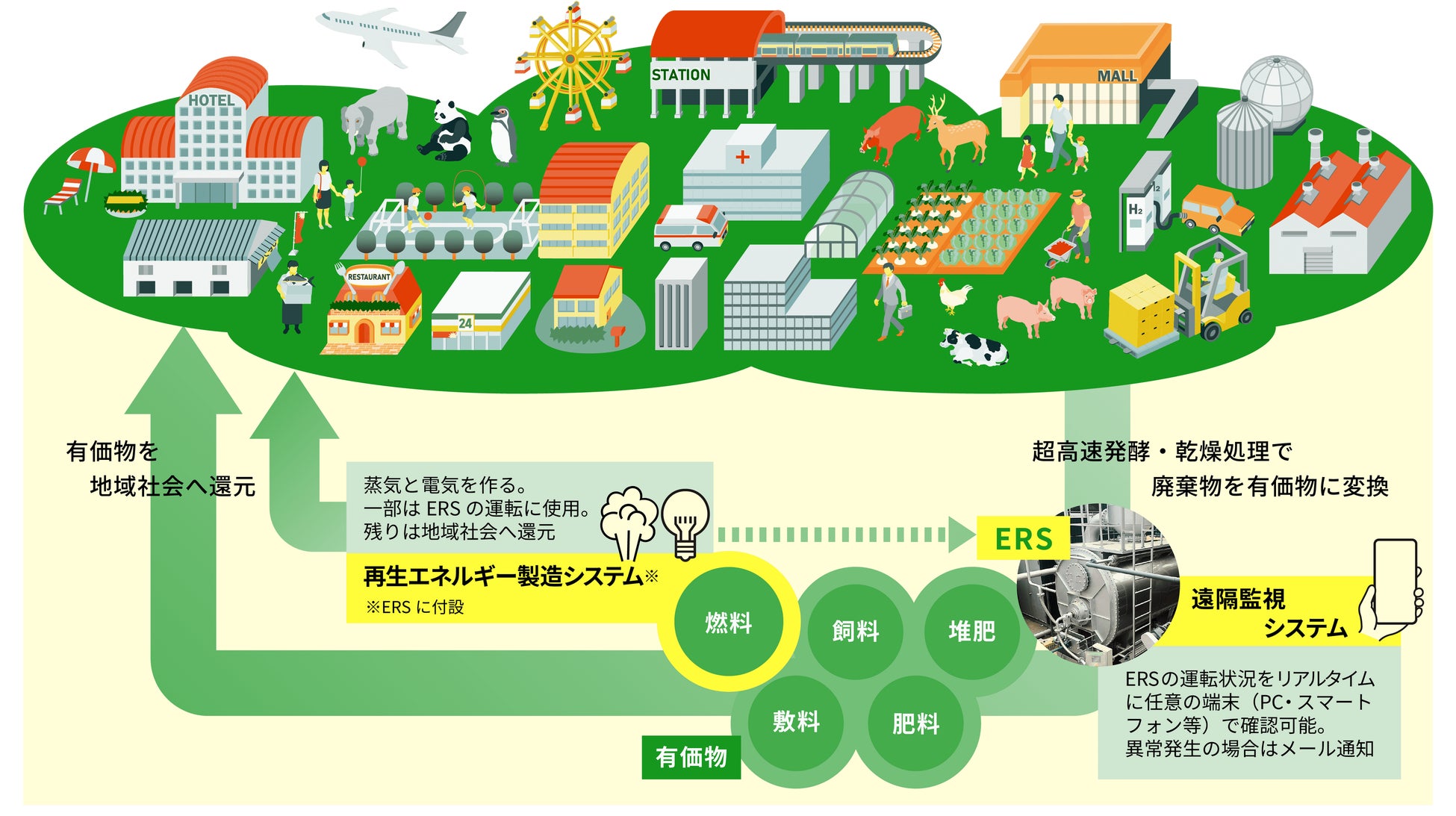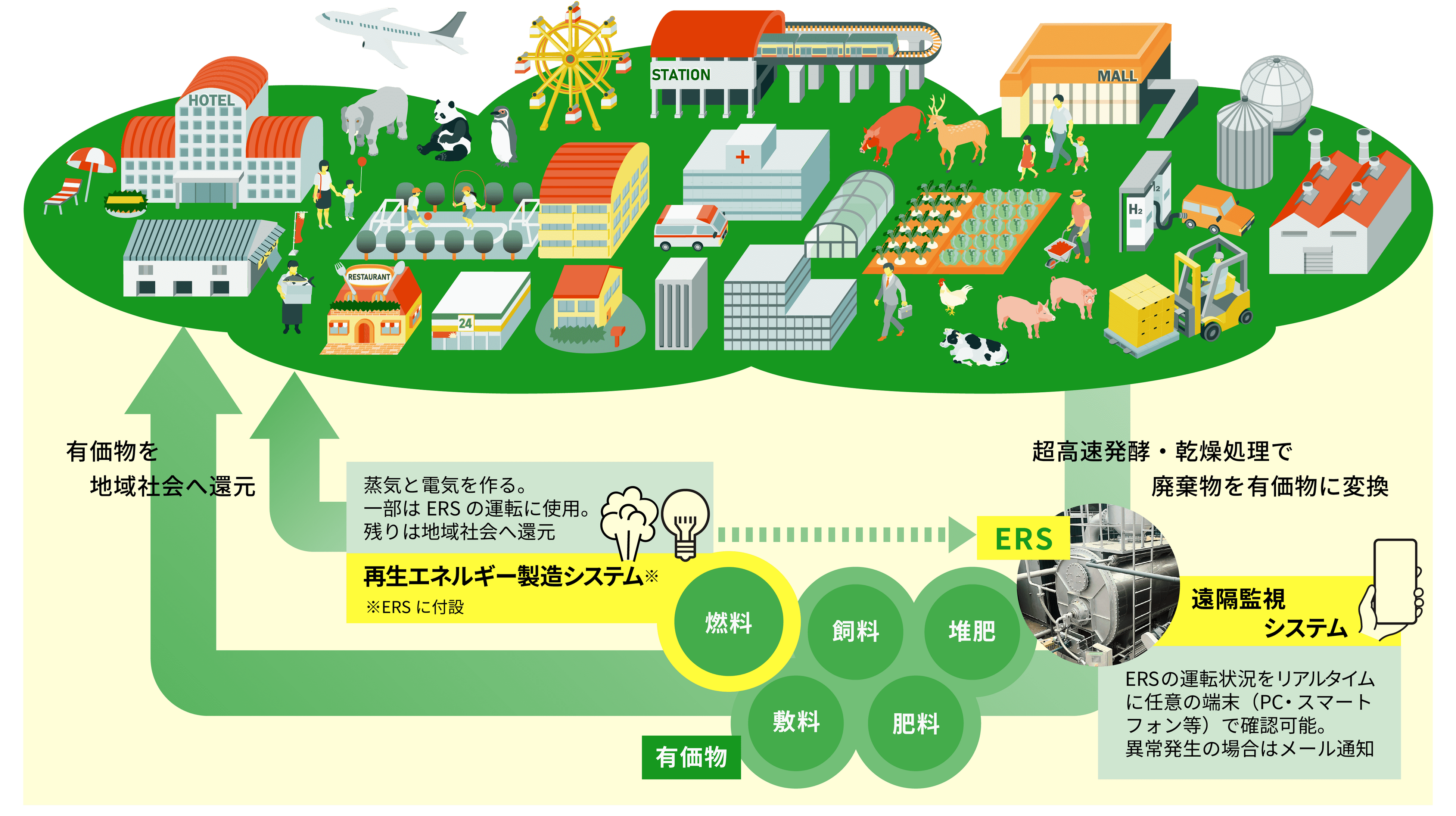 ERS は、設置場所の周辺に生息する土着菌を活用し、対象物を1日で殺菌・発酵・乾燥して資源に変えるシステムです。また、ERSの資源化処理により生成した成果物は、含水率の低い良質な燃料や堆肥、肥料、飼料、敷料として利用できます。ゼロエミッションの実現に、ERSをご活用ください。