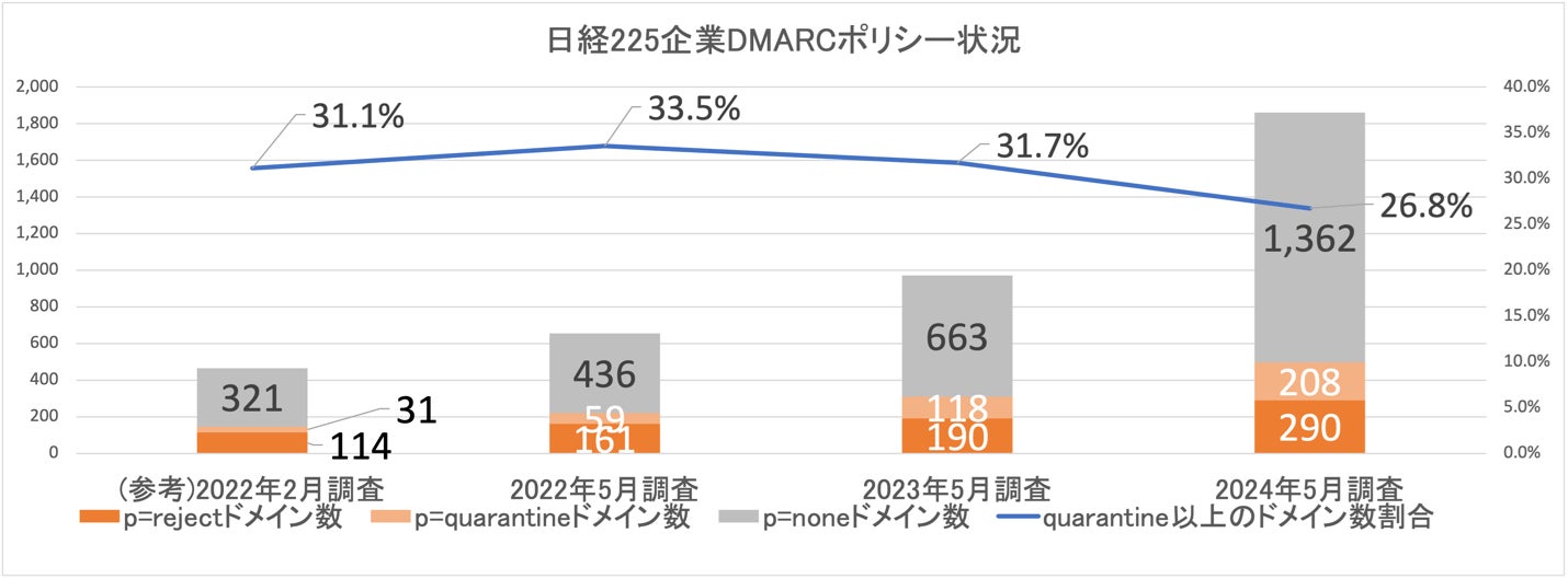 TwoFiveの調査において、日経225企業は、2024年5月時点で、206社(91.6%)が少なくとも1つのドメインでDMARCを導入し、昨年同月(140社 / 62.2%)と比較すると1年間で29.4ポイント増加しました。