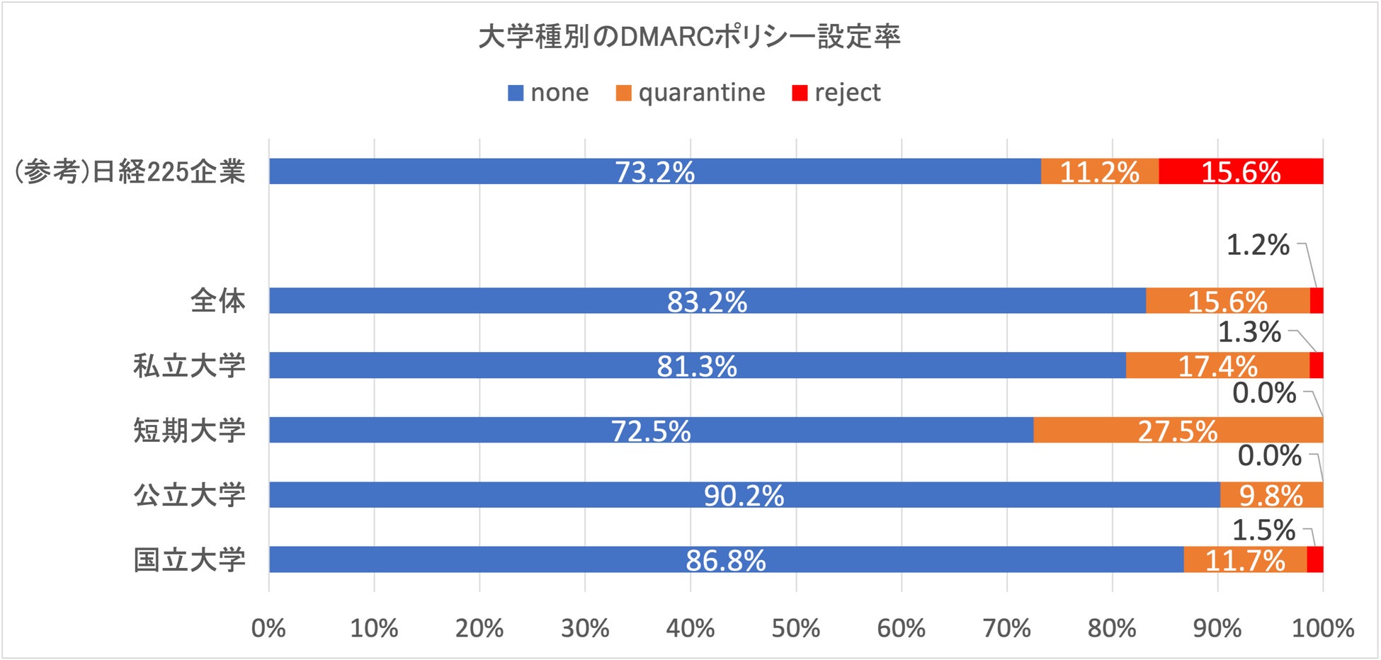 また、DMARC導入済みの2,890ドメインのうち、全体では83.2%がnoneのポリシー設定で、強制力のあるポリシー(quarantine、reject)への切り替えも今後の課題です(図7)。