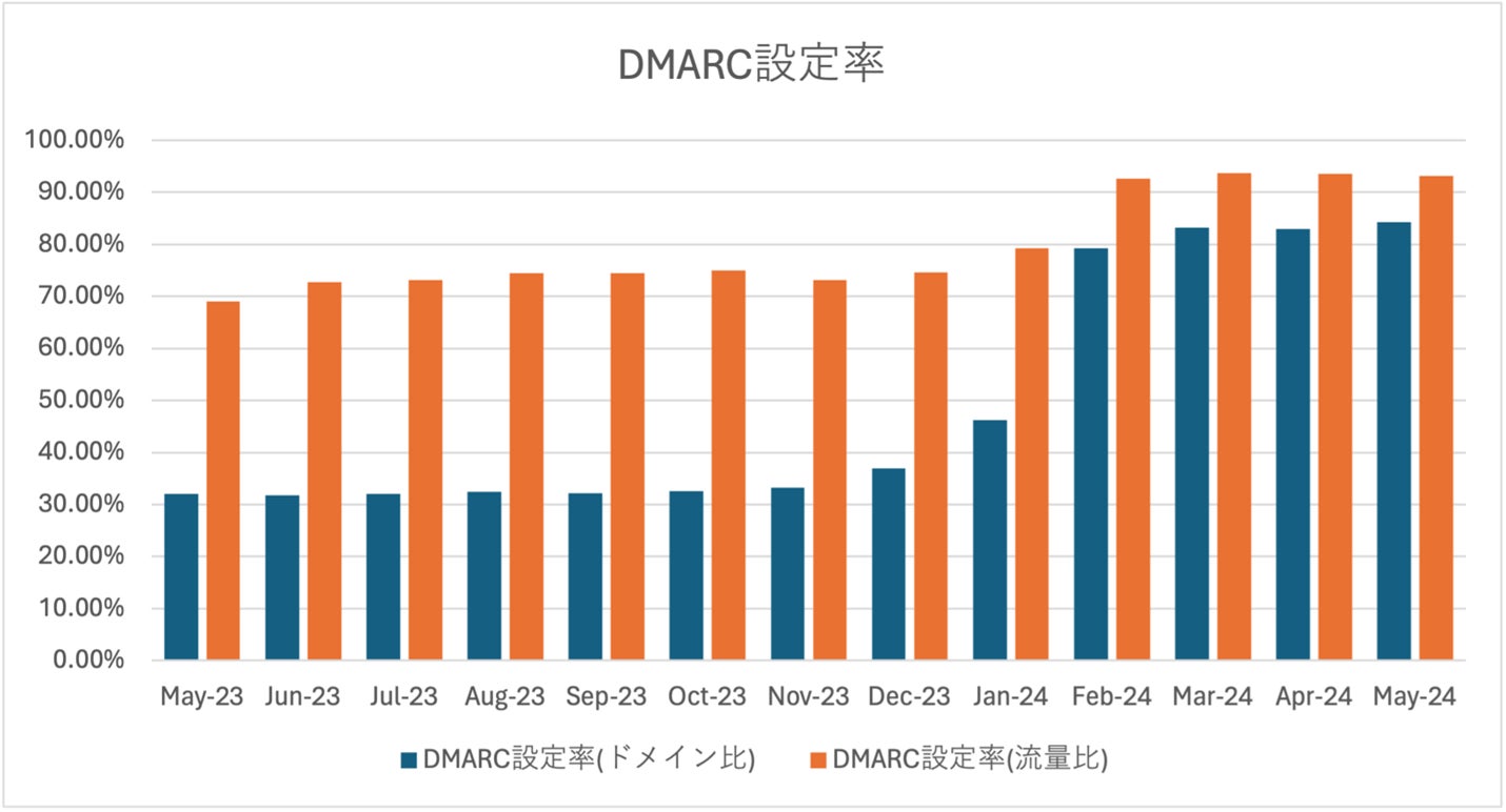 Mail Publisher利用ユーザーのDMARC設定率は、2024年5月時点で、全ドメインの84.3% / 全流量数の93.1%です。