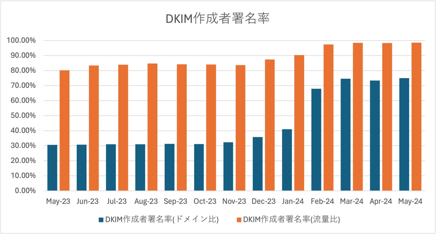 DKIMの作成者署名を利用してDMARC認証を成功させることでメール転送などの認証失敗を回避することができることから、DMARC設定と併せてDKIMの作成者署名設定が増加していることは、適切なメール認証が実現しつつある状況といえます。