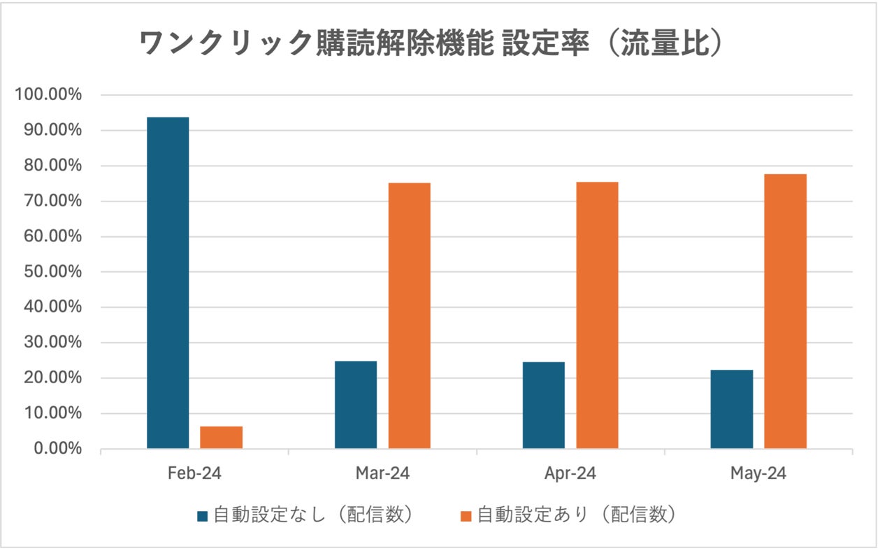 メール送信者向け新ガイドラインでは、商用の宣伝メッセージの場合、ワンクリックでの購読解除(RFC8058 / List-Unsubscribe)に対応する必要があります。エンバーポイントは、今年1月、この条件を自動的に満たして配信できるよう、Mail Publisherに「ワンクリック購読解除機能」を新たに追加しており、1月下旬の提供開始から現在までの約3カ月間で、 全配信数の77.7%が利用しています。