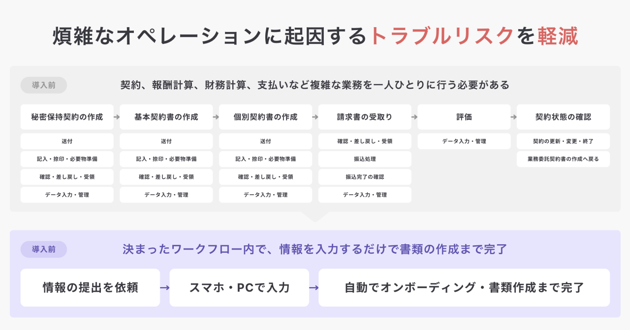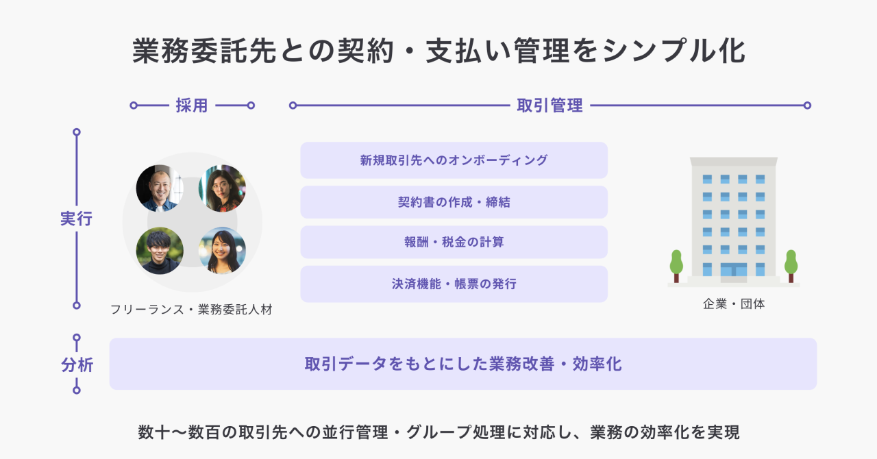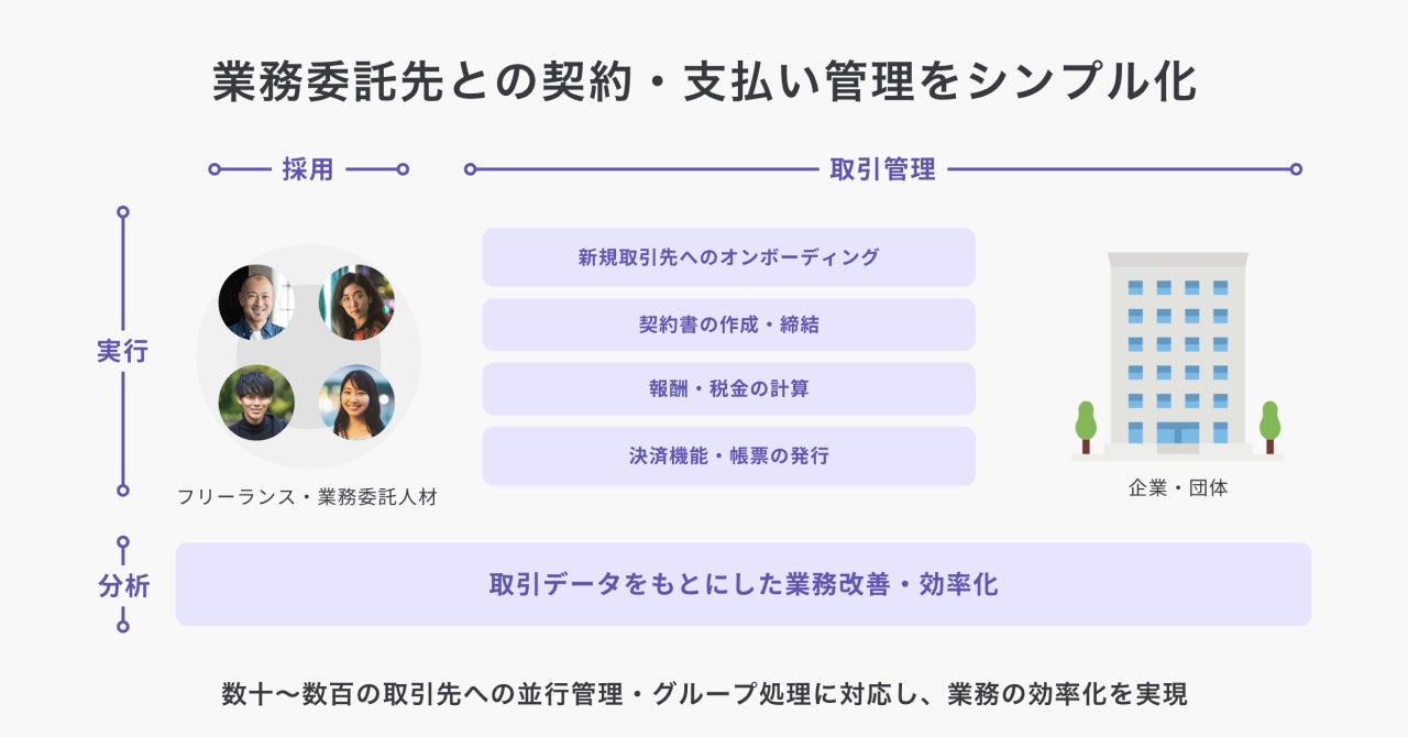 高い業務委託人材比率で構成されたスタートアップやベンチャー企業、副業人材のみで構成されたクリエイターギルドも珍しくない社会になりました。業務委託人材は、採用から実務までのスピードや高い機動力と専門性を持ちますが、契約や報酬の支払いが煩雑になってしまう現場も珍しくありません。
