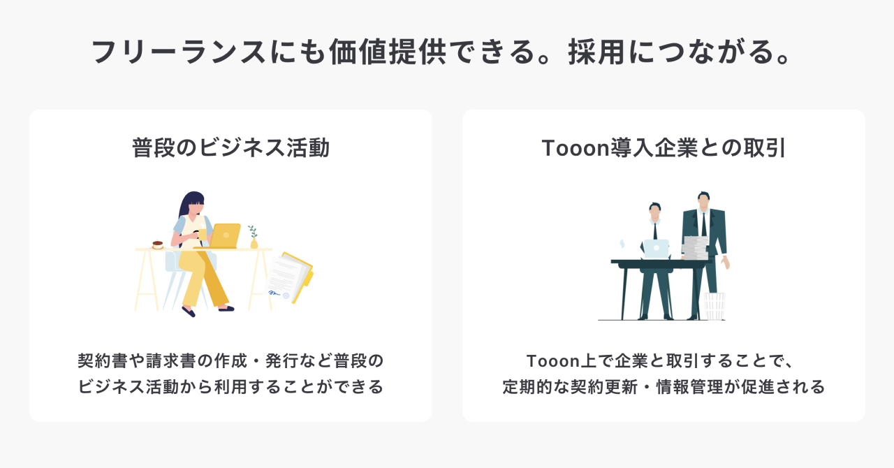 Tooon for Teamsはフリーランス向けオールインワンツールTooon(トゥーン)の一機能になります。委託先の事業者は普段から利用されているTooonのアカウントをそのままご利用いただけます。