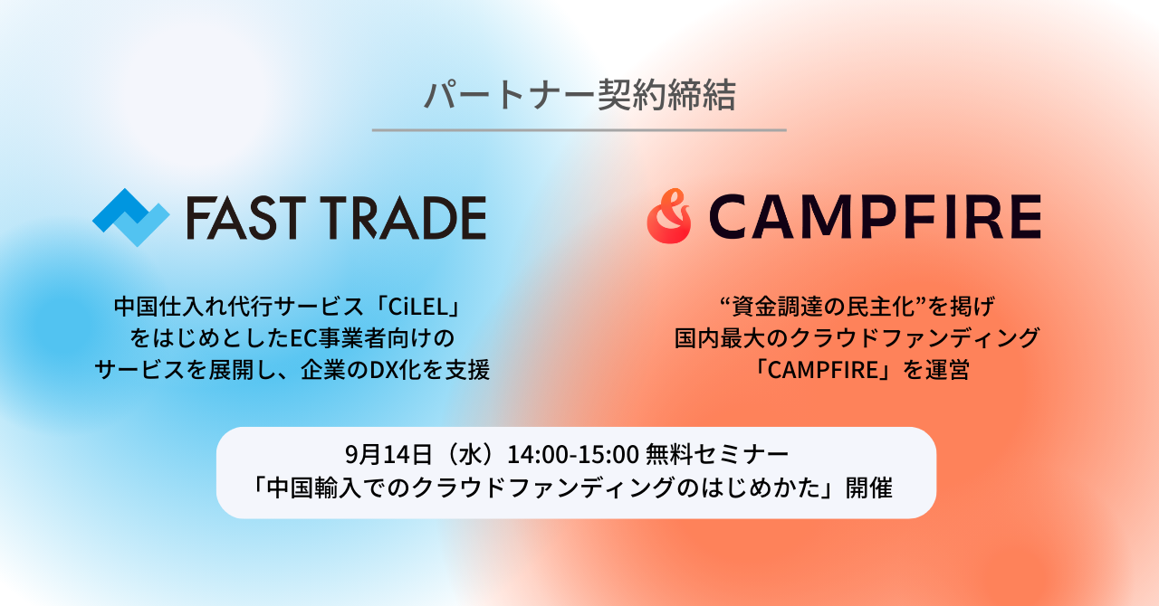 EC事業支援を行うファーストトレード株式会社(所在地:福井県あわら市、代表取締役:三上良平、以下 当社)は、国内最大のクラウドファンディングサービス「CAMPFIRE(キャンプファイヤー)」を運営する株式会社CAMPFIRE(所在地:東京都渋谷区、代表取締役:家入一真、以下 CAMPFIRE社)とのパートナー契約を締結致しました。