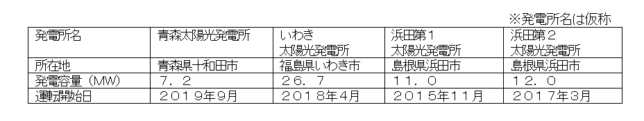 本事業は、青森県十和田市、福島県いわき市、島根県浜田市において稼働する4ヵ所の太陽光発電所を対象としており、出力規模は合計57MWとなります。