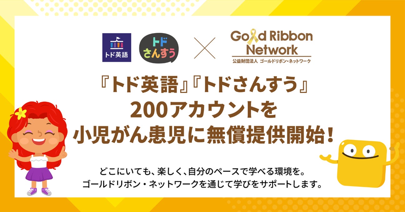 Enuma Japan合同会社(所在地:東京都千代田区、職務執行者:スイン・リー、以下Enuma Japan)は、小児がんの子どもたちとそのご家族を支援する公益財団法人ゴールドリボン・ネットワーク(所在地:東京都豊島区、理事長:磯中淳、以下「ゴールドリボン・ネットワーク」)を通じて、家庭学習アプリ「トド英語」「トドさんすう」それぞれ100アカウント(合計200アカウント)を無償提供いたします。