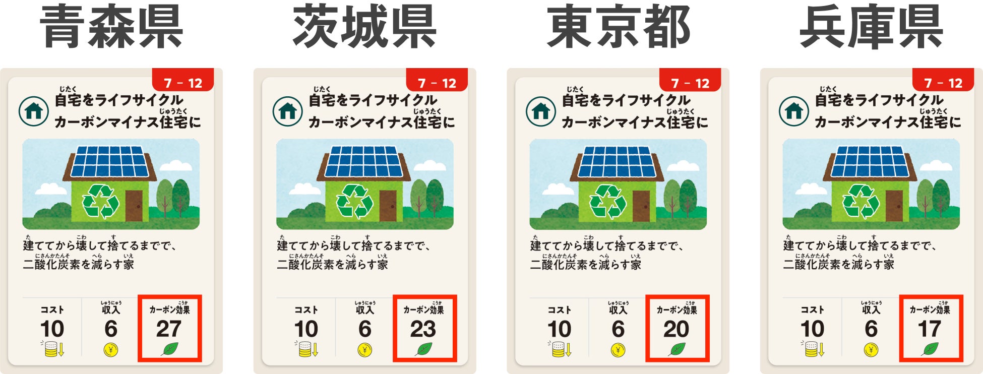 ゲームに登場するアクションの効果(CO₂削減量)は、「国内52都市における脱炭素型ライフスタイルの選択肢カーボンフットプリント 削減効果データブック(出所:公益財団法人 地球環境戦略研究機関(IGES: アイジェス)」に基づいており、ゲーム内で強力なカードは、現実世界でも削減効果が大きいアクションとなります。遊びながら、科学的に正しい知識が自然と身につきます。