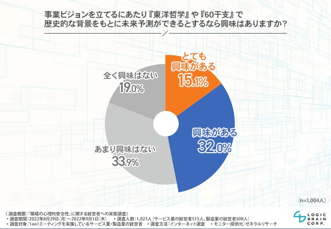 「事業ビジョンを立てるにあたり『東洋哲学』や『60干支』で歴史的な背景をもとに未来予測ができるとするなら興味はありますか?」と質問したところ、4割以上の方が『とても興味がある(15.1%)』『興味がある(32.0%)』と回答しました。
