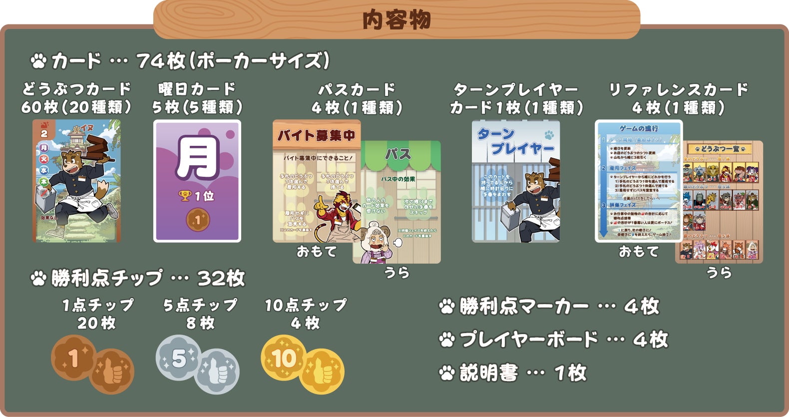 内容物:どうぶつカード 60 枚 / システムカード 14 枚 / プレイヤーボード 4 枚 / 勝利点チップ 32 枚 / 勝利点マーカー 4 個